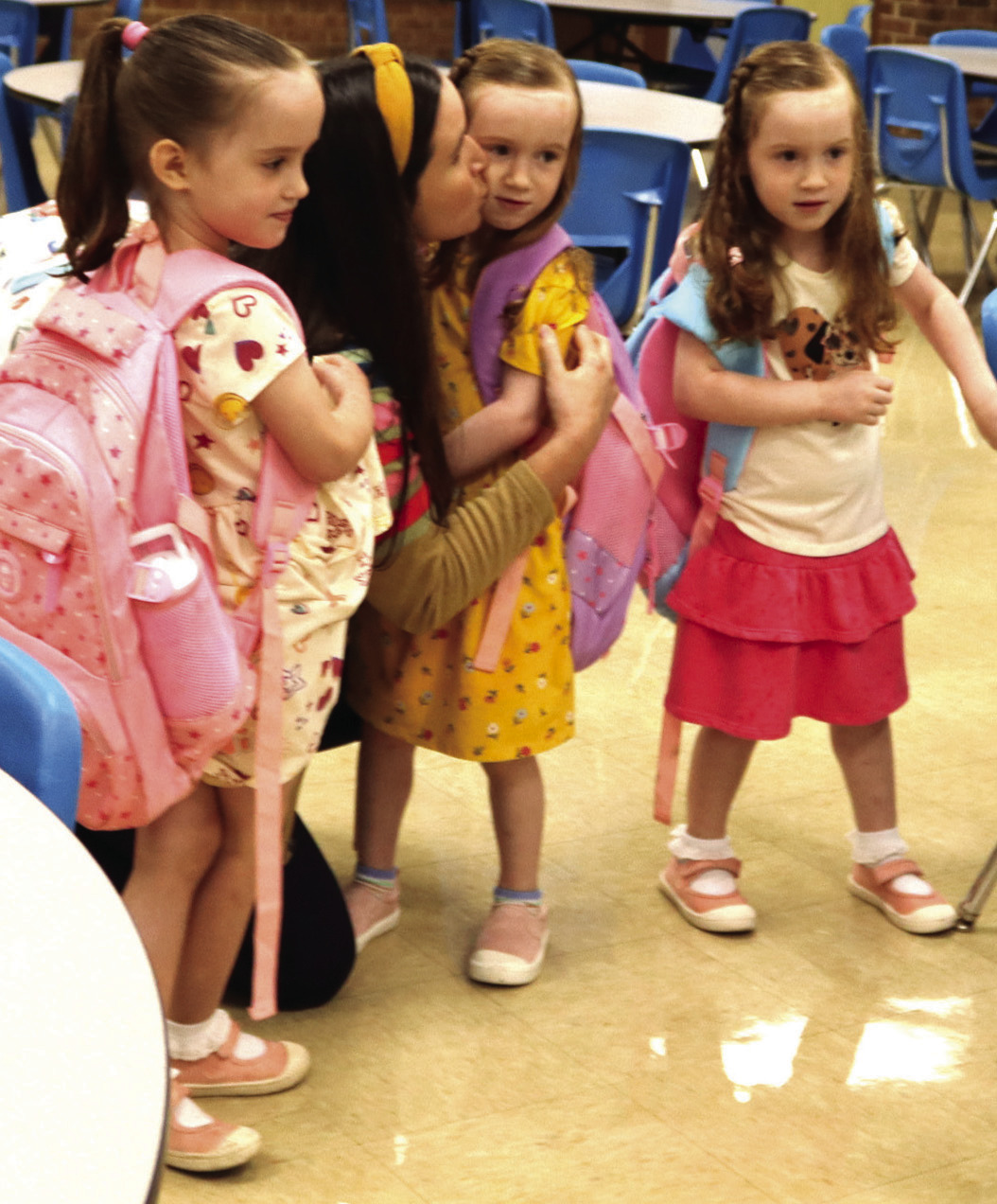 THE Kayser triplets at Kling Elementary School get a kiss from their mother on the first day of school. (Stephanie Mikels Blevins photo)
