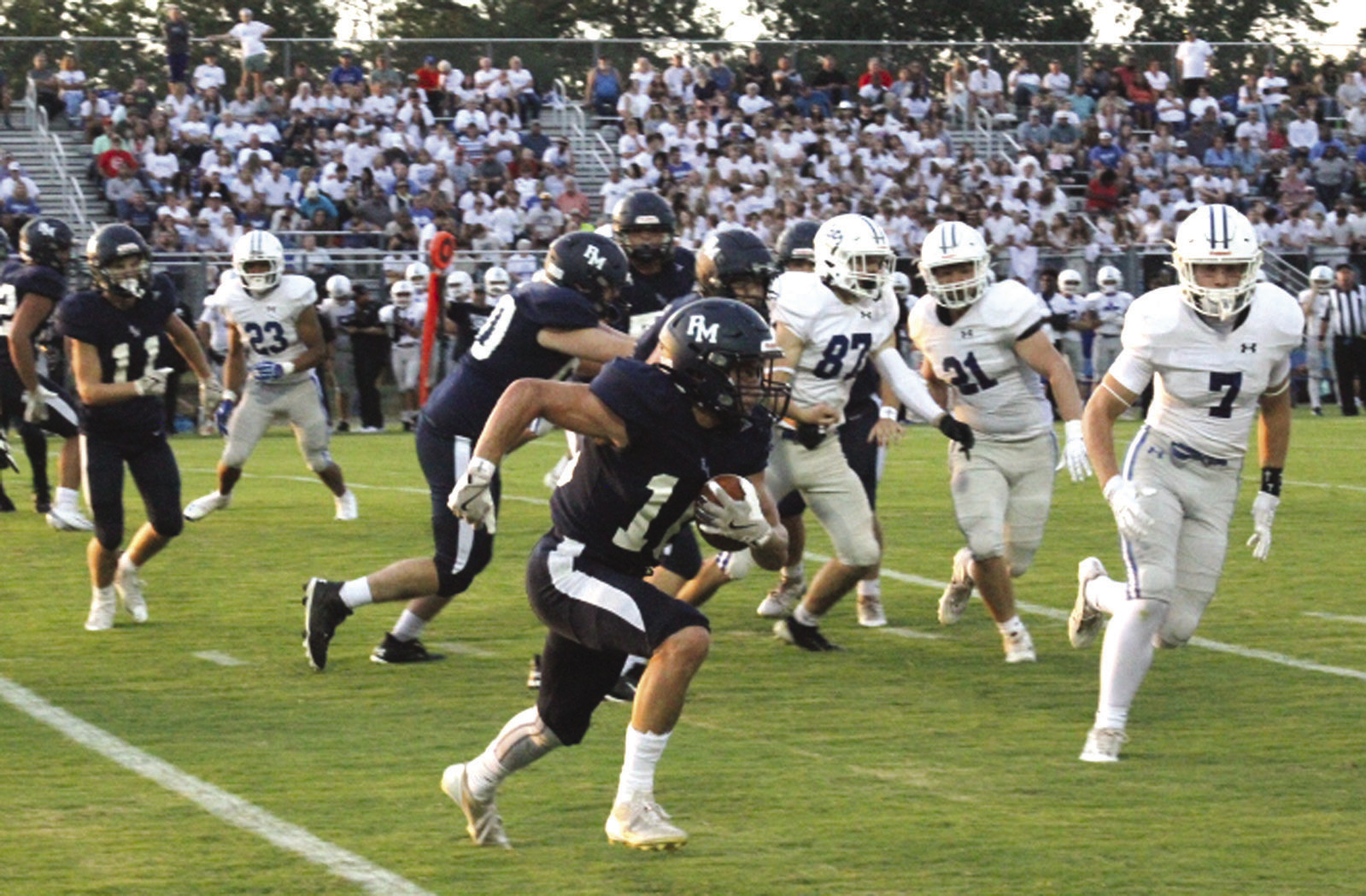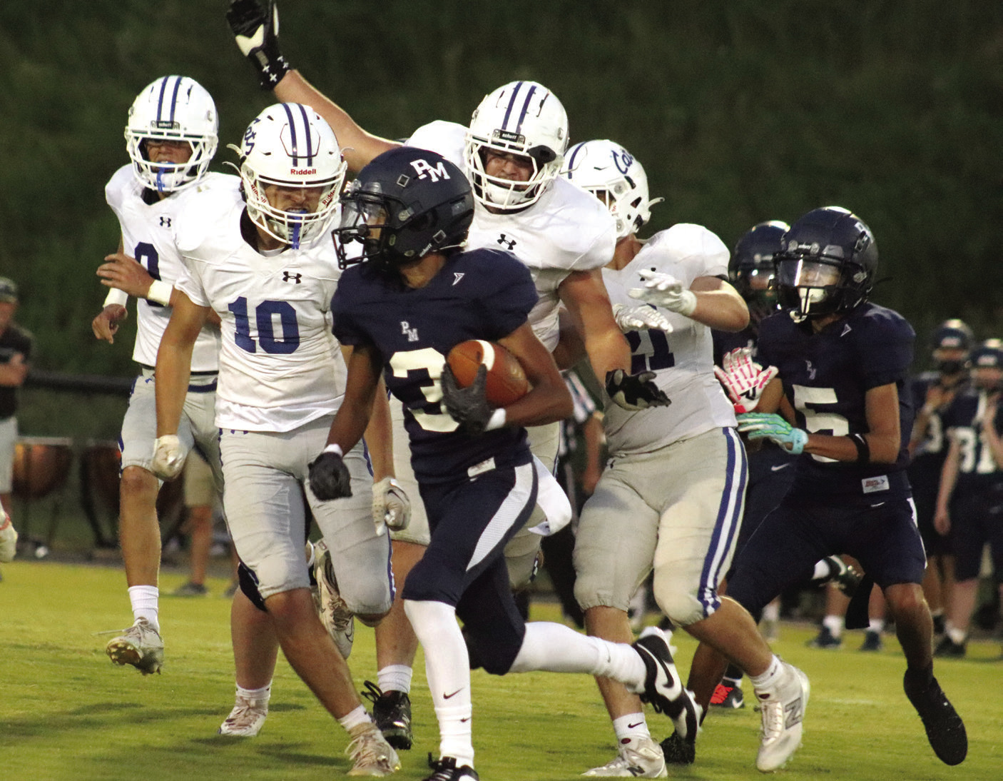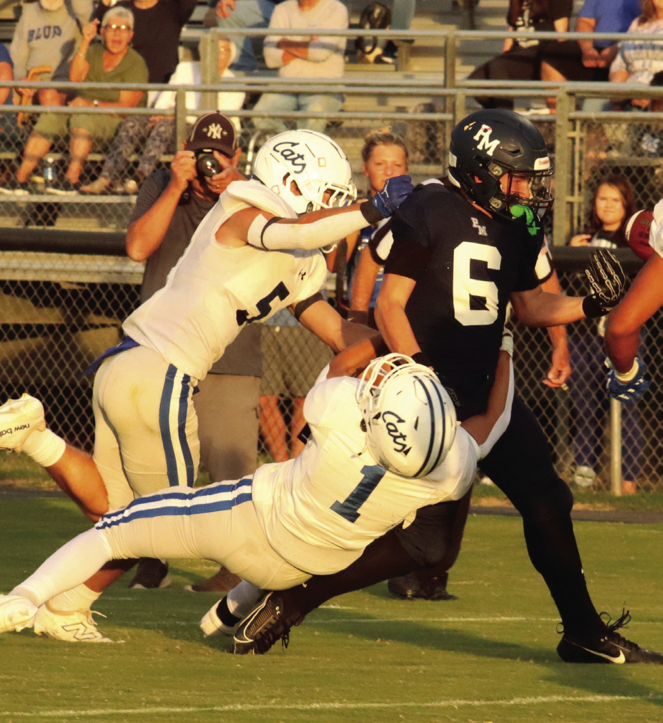 RC DEFENSIVE backs Pat Looney (5) and Marshall Earhart (1) attempt to take down PM sophomore running back Brody Coleman. (Stephanie Mikels Blevins photo)