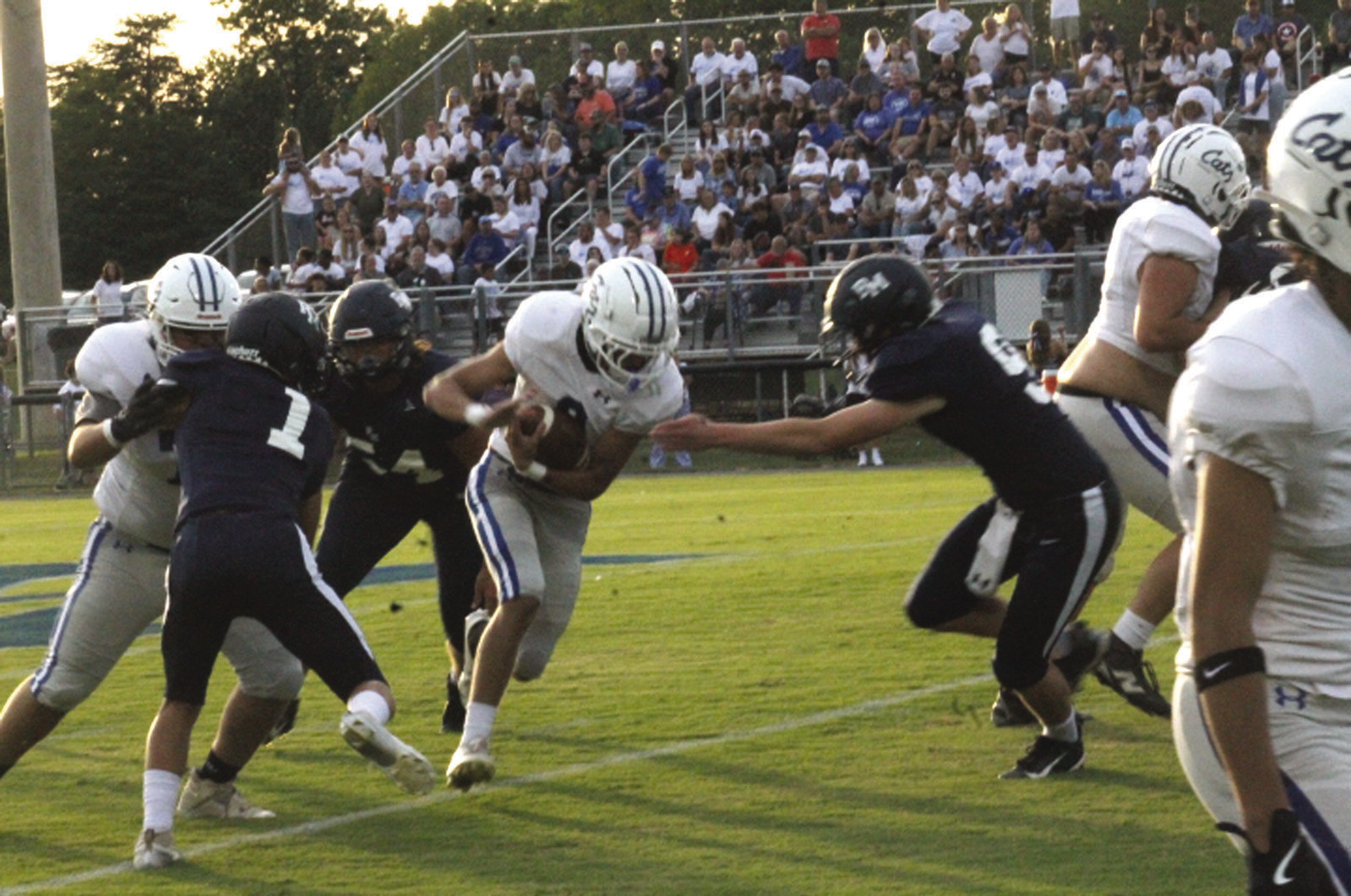 FIGHTING BLUE junior running back Parker Snider runs with the ball as Wildcats Pat Looney (center) and Eli Sorrells (9) approach. Snider rushed for 63 yards on 14 carries. (Stephanie Mikels Blevins photo)