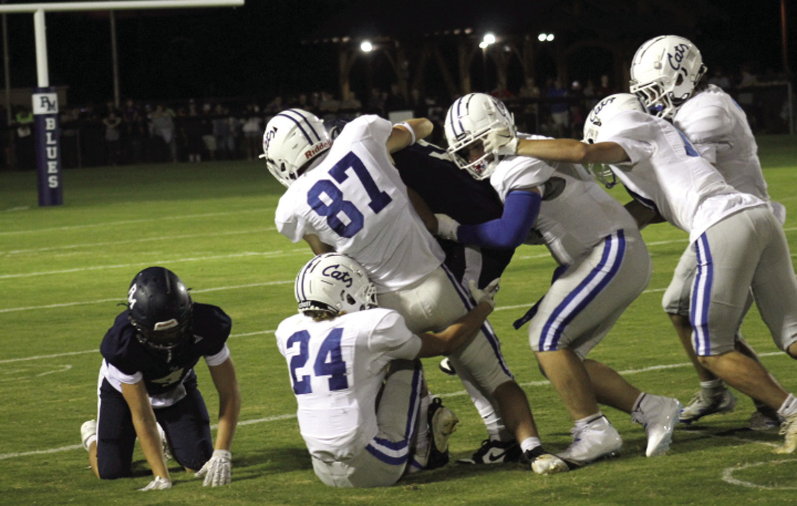 A FLURRY of Wildcats and Blues swarm in around the ball. Among them are PM’s Kyle Smals (9) and RC’s Marquez Flowers (70) andAiden Meyers (4). (Ronnie Coffey photo)