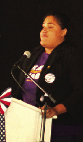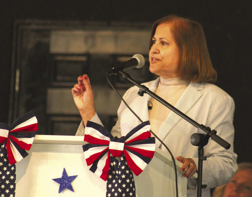 STATE SEN. Ghazala Hashmi, Democratic candidate for lieutenant governor, makes a point while delivering a speech at the park. (all photos taken by Stephanie Mikels Blevins)