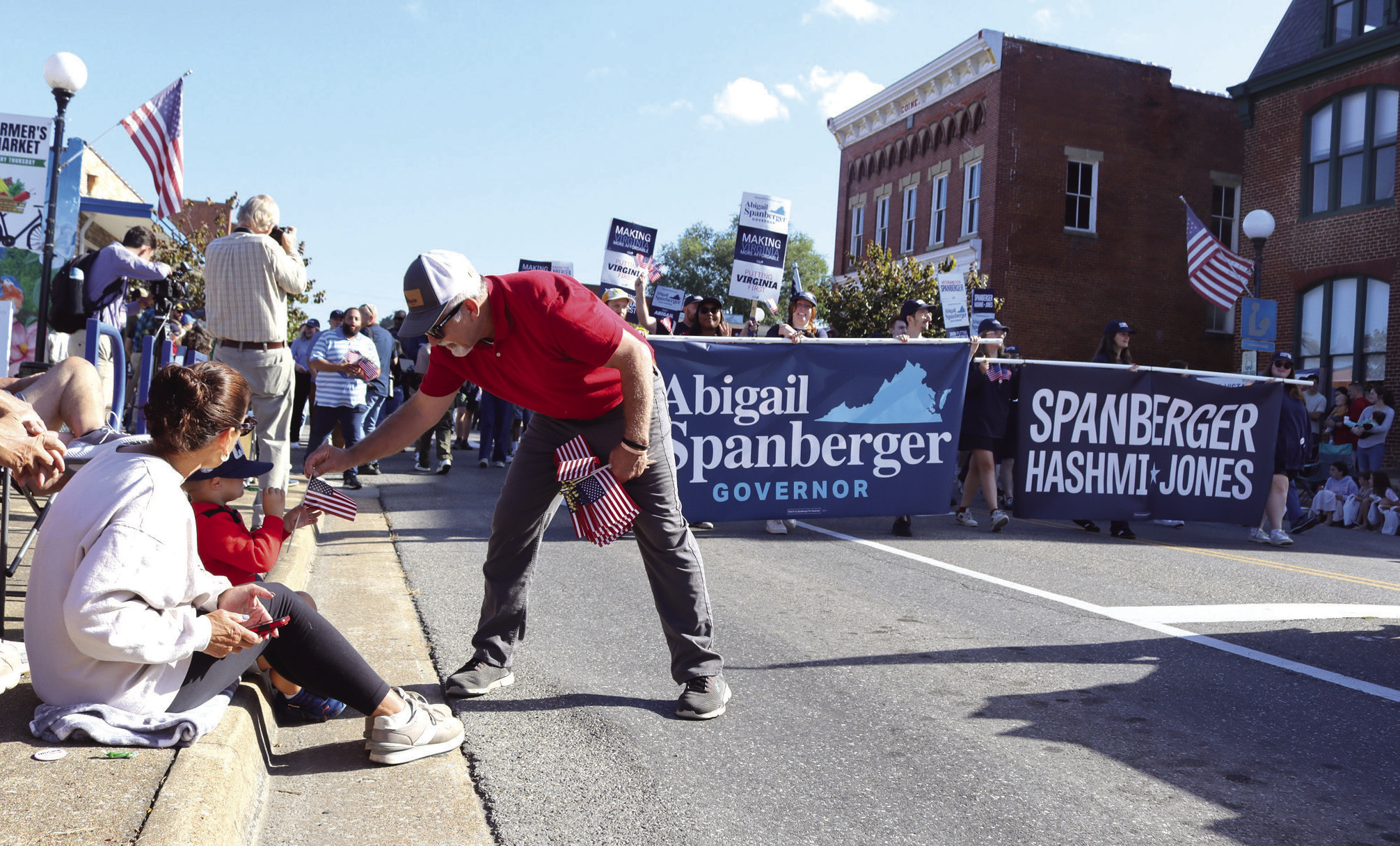 HANDING out American flags on the parade route is a supporter of the Democratic candidates. (Stephanie Mikels Blevins photos)