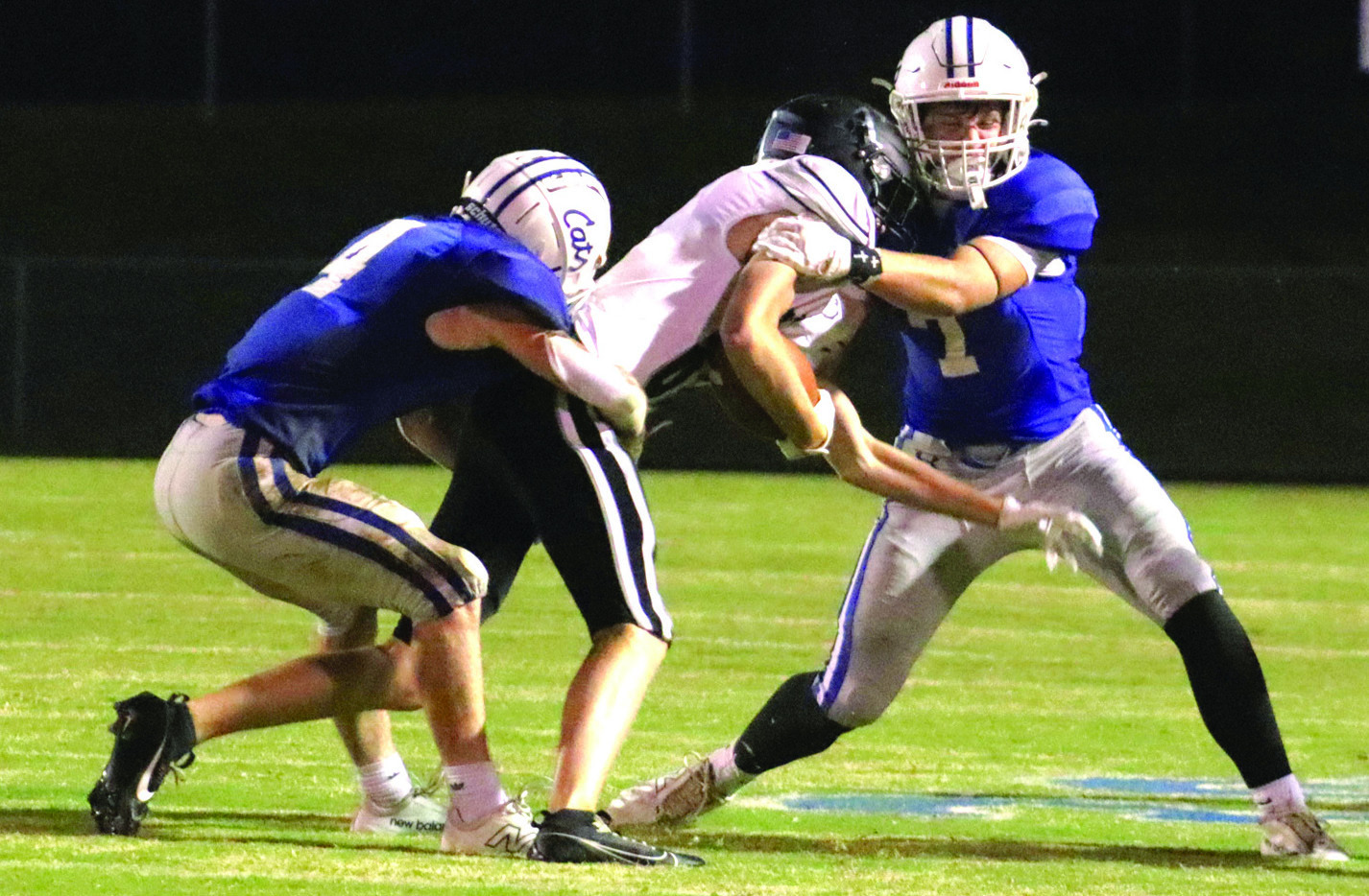 ABOVE, a whole host of Rockbridge County defenders converge on a Turner Ashby runner in high school football action last Friday night in Lexington. The Knights handed the Wildcats their second straight setback, 44-6. AT LEFT, chasing down a Turner Ashby ball carrier, Rockbridge County’s Marshall Earhart (1) and Aiden Meyers (4) make the open field tackle last Friday night in Lexington. (Stephanie Blevins photos)