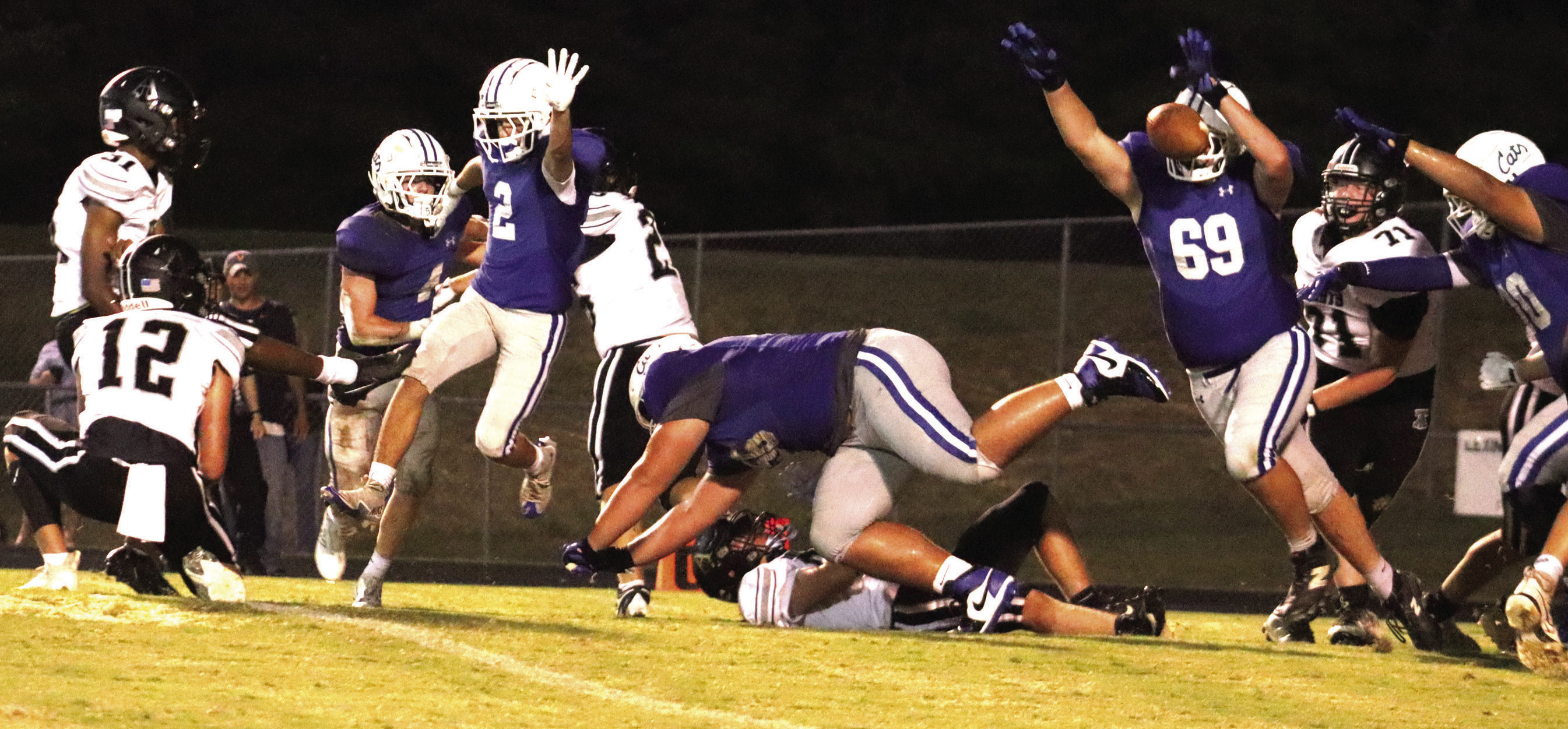 ROCKBRIDGE COUNTY’S Trevor Hoke (2) applies the pressure, while Caleb Robinson (69) breaks through the line to block an extra point in high school football action against Turner Ashby last Friday night in Lexington. The Wildcats dropped their second straight game, falling to the Knights, 44-6. (Stephanie Blevins photo)