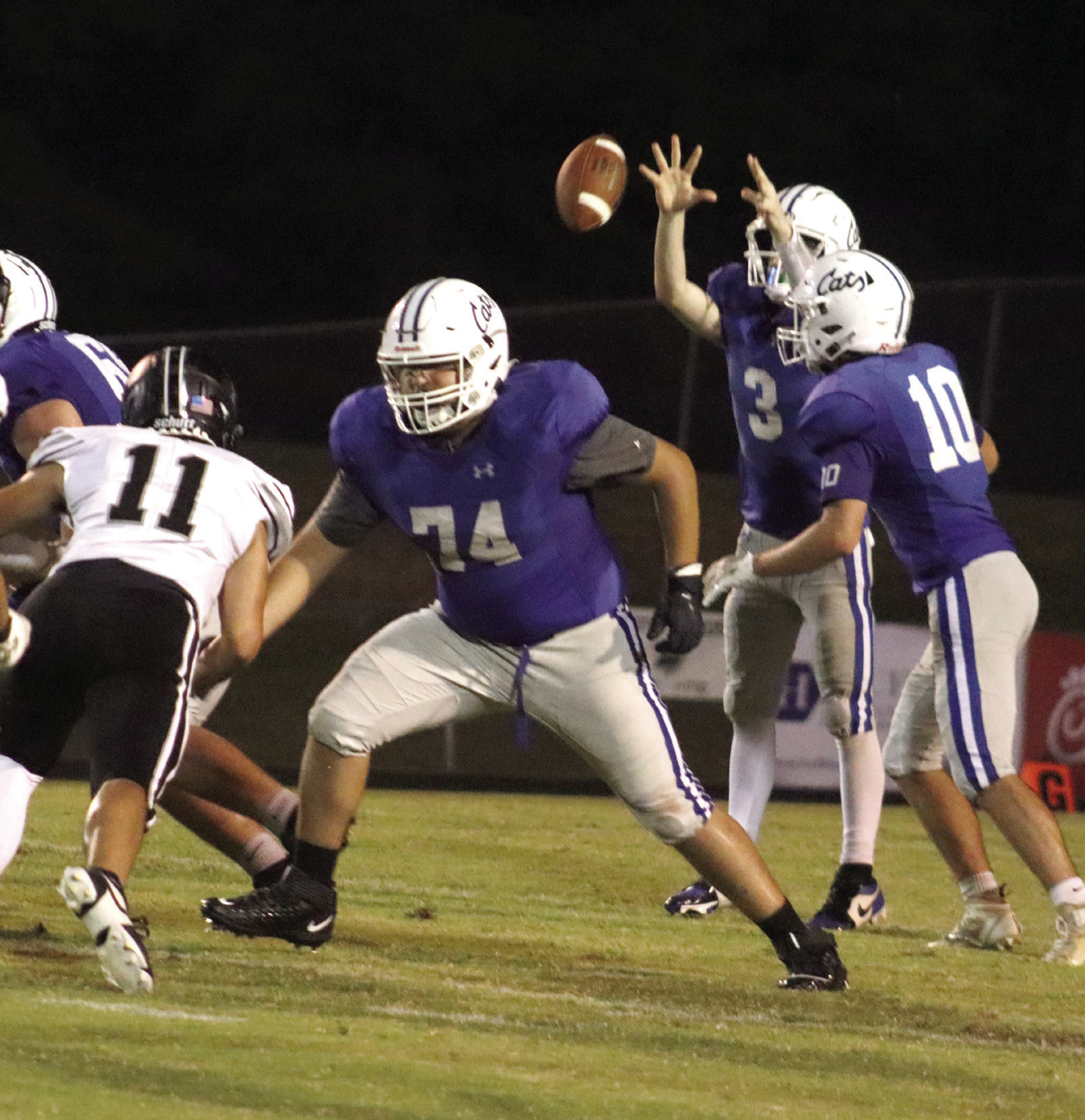 WITH OFFENSIVE LINEMAN Carlos Yebra (74) offering protection, Rockbridge County quarterback Taylan Tyree (3) goes up high to snag a snap as Andrew Kelly (10) prepares to take a handoff against Turner Ashby last Friday night in Lexington. Tyree and the Wildcats were stymied by the Turner Ashby defense, and the Knights scored a 44-6 victory. (Stephanie Blevins photo)