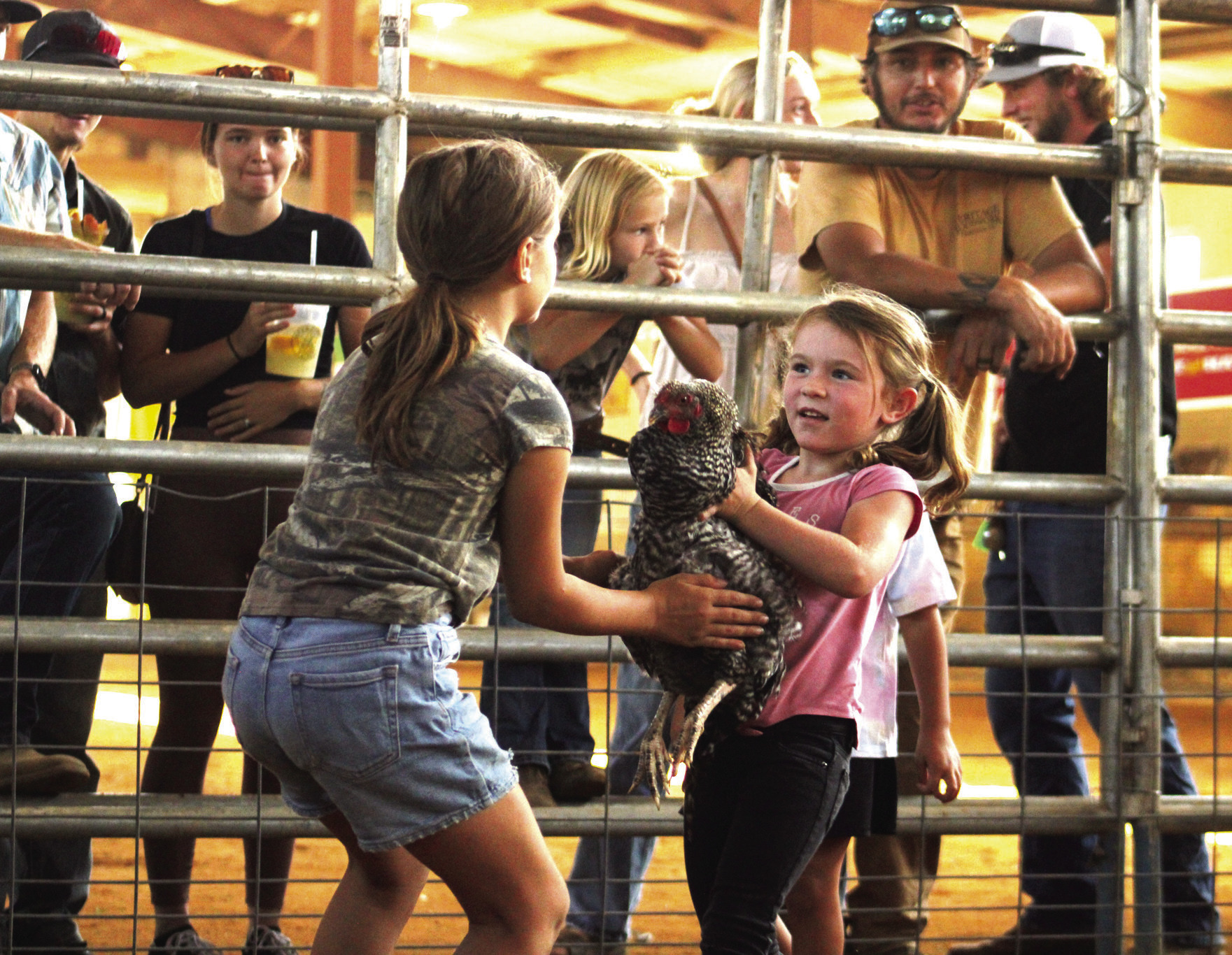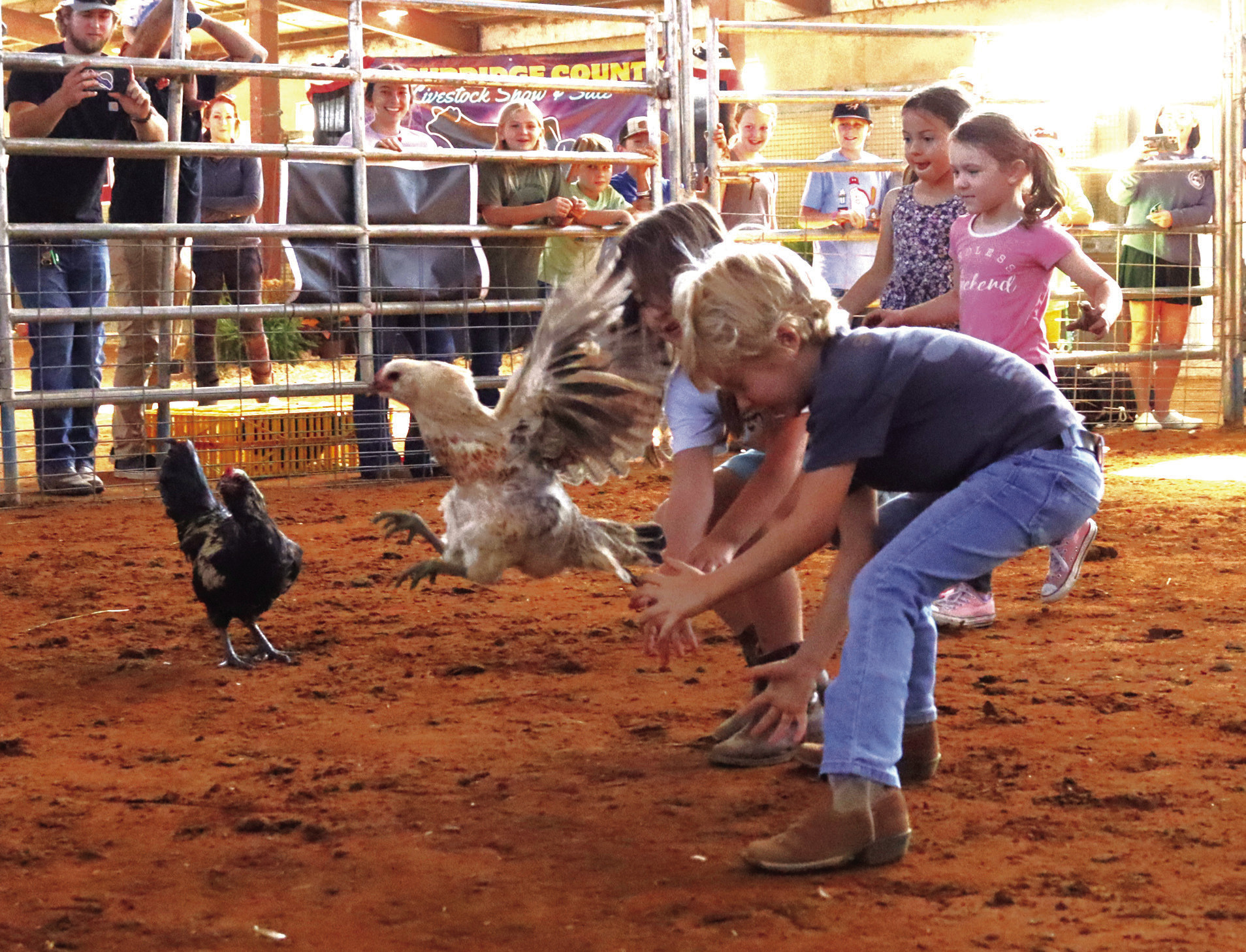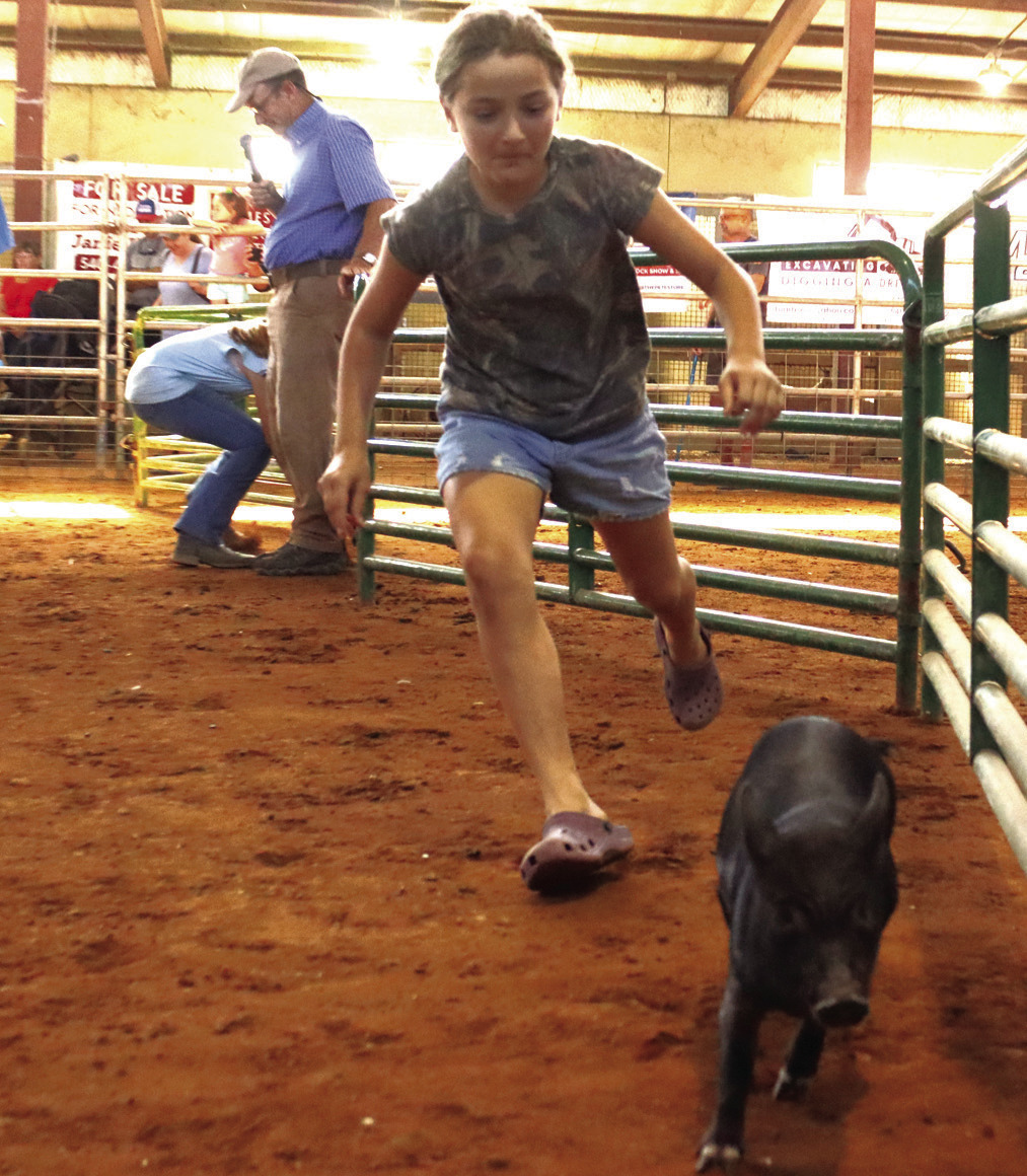 Area youngsters showed their quickness in the Critter Scramble Saturday at the Rockbridge Regional Fair. Five- and 6-year-olds, along with 7- and 8-year-olds, corralled chickens, while goats were the goal for 9- and 10-yearolds, and piglets tried to outrun the 11- and 12-year-olds. (Stephanie Mikels Blevins photos)