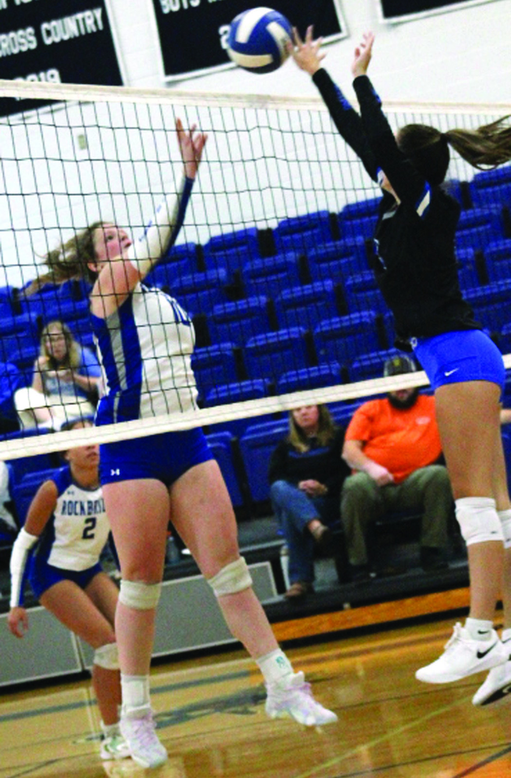 ROCKBRIDGE COUNTY’S Mackenzie McCormick (10) eases a ball over the net as Parry McCluer’s Caroline Watts attempts a block in the clash between rival volleyball teams Monday, Sept. 8, in Buena Vista. The Wildcats won the contest in straight sets and took their second win of the season from the Blues. (Ronnie Coffey photo)