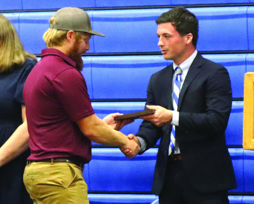 Speaking on behalf of Wagner was his father, Shawn, who came to the podium with Koda’s son, Danger, and Koda’s brother, Kaden. Shawn said he was “very honored” to accept the award and then told a story that showed Koda’s dedication. When Koda was in high school, Shawn said, he would write his goals down. As a sophomore or junior, he wrote that he wanted to win the district and regional titles. Then as a senior, Koda wrote that his goal before he graduated was to win a state championship.