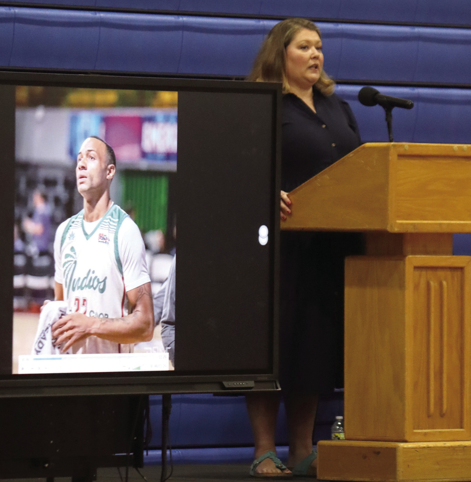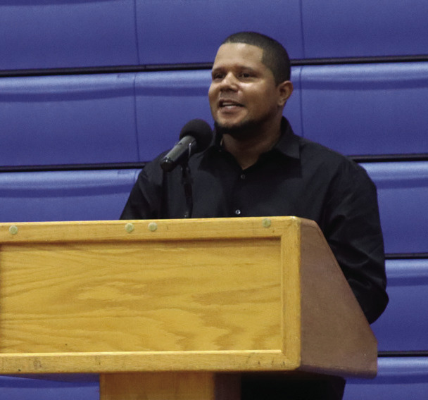 ABOVE, Valerie Clay, RC Athletic Hall of Fame committee member and the master of ceremonies for the inductions, honors inductee Jeffrey Early Jr. (shown on screen), who was unable to attend because he is playing professional basketball in Europe. AT UPPER RIGHT, Inductee Jonathan Wilson talks about the lessons he learned as a football, basketball and baseball player. AT RIGHT, Accepting his induction, Bruce Cooper expresses his gratitude. (Stephanie Mikels Blevins photos)