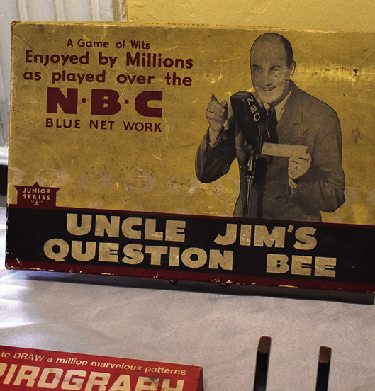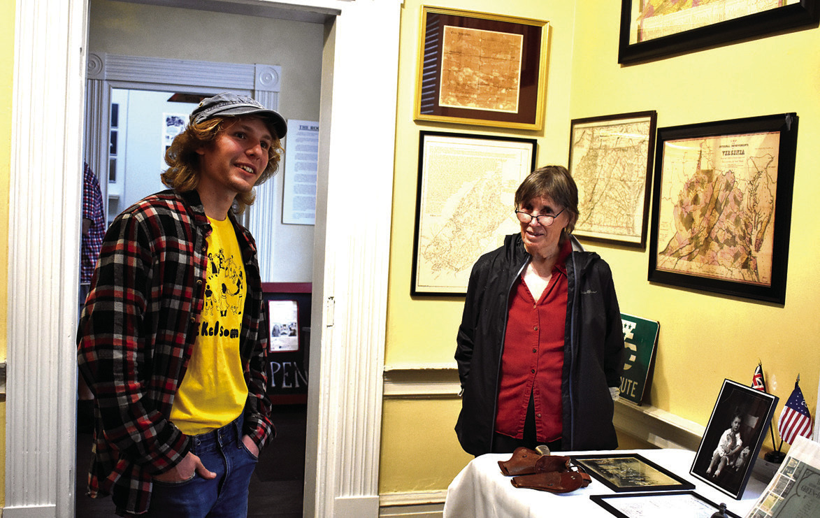 The public was invited to the Campbell House, the headquarters of the Rockbridge Historical society, Saturday, Sept. 27, to share their toys in conjunction with the exhibit, “Rockbridge at Play: Toys, Games & Histories.” ABOVE, many of the toys were from the personal collection of RHS trustee Peter Simpson.ATLEFT, the board game Uncle Jim’s Question Bee was based on a radio quiz show popular in the late 1930s and early 1940s. BELOW, RHS board member Simon Rozsa and historian Cinder Stanton discuss the local and social histories of some of the displayed toys. Rozsa, a sophomore at Washington and Lee University, is from Budapest, Hungary. (Joann Ware photos)