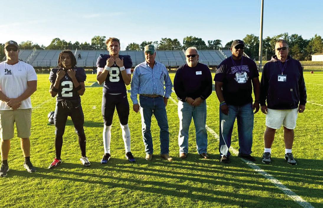 PRIOR TO LAST Friday night’s football game in Buena Vista, former and current record holders were recognized at midfield. Included in the photo are (from left): current Parry McCluer had coach Jeremiah Brockenbrough; Zavion Dunn and Nathan Glass, who combined for a 95-yard touchdown pass to set the new record; Carson Irvine and Hans Mohler, co-captains from the 1977 state championship team; and Mickey Branch and Marty Carter, who set the previous record in 1977. (Chris Floyd photo)