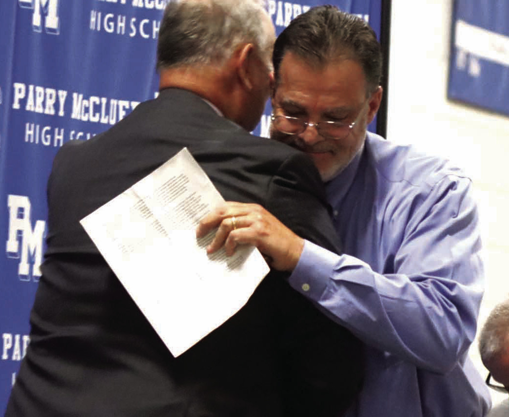 PM ATHLETIC Hall of Fame committee member Nelson Fox (left) hugs inductee Troy Clark, whom Fox coached in basketball. (Stephanie Mikels Blevins photo)