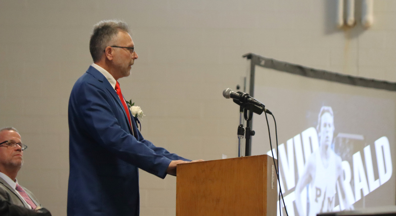 INDUCTEE DAVID Fitzgerald Jr. talks about coaches and teammates who helped him succeed as a distance runner. (Stephanie Mikels Blevins photo)