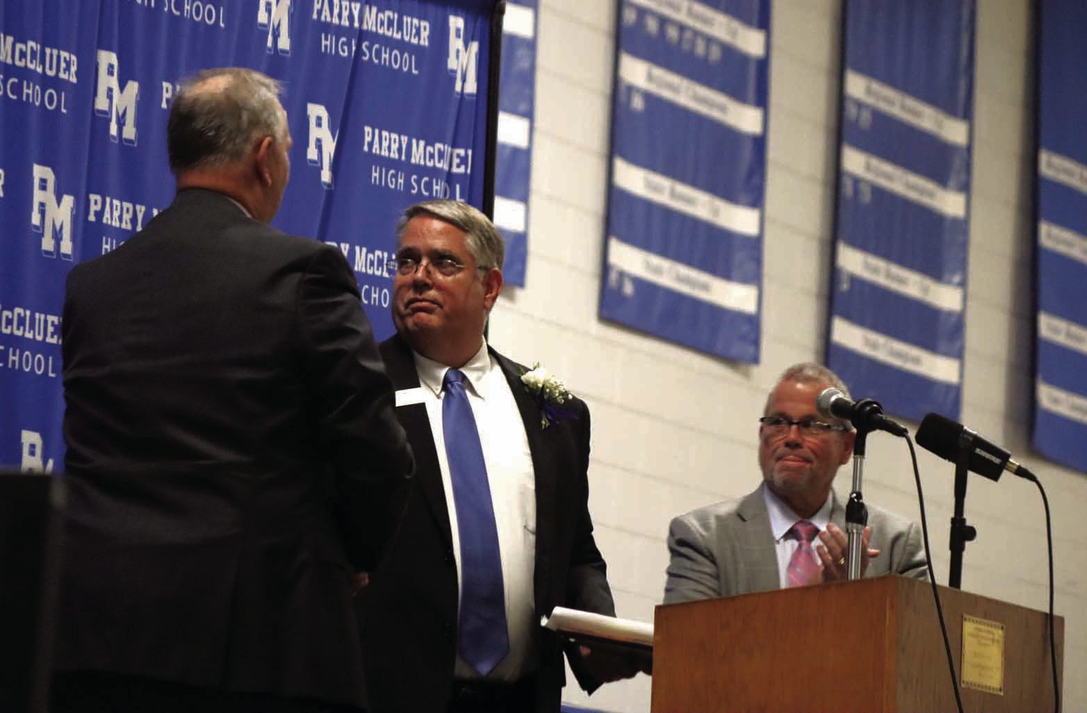 BEN BURKS (center) who was inducted as a three-sport athlete, receives a congratulatory handshake from PM Athletic Hall of Fame committee member Nelson Fox while William Kerr (right), who introduced the inductees, watches. (Stephanie Mikels Blevins photo)