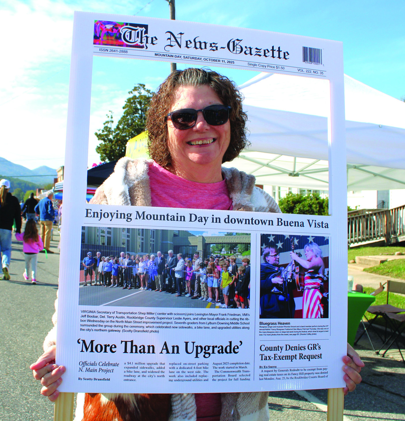 Carol Slagle gets her face on the front of The News-Gazette at the newspaper’s Mountain Day booth.