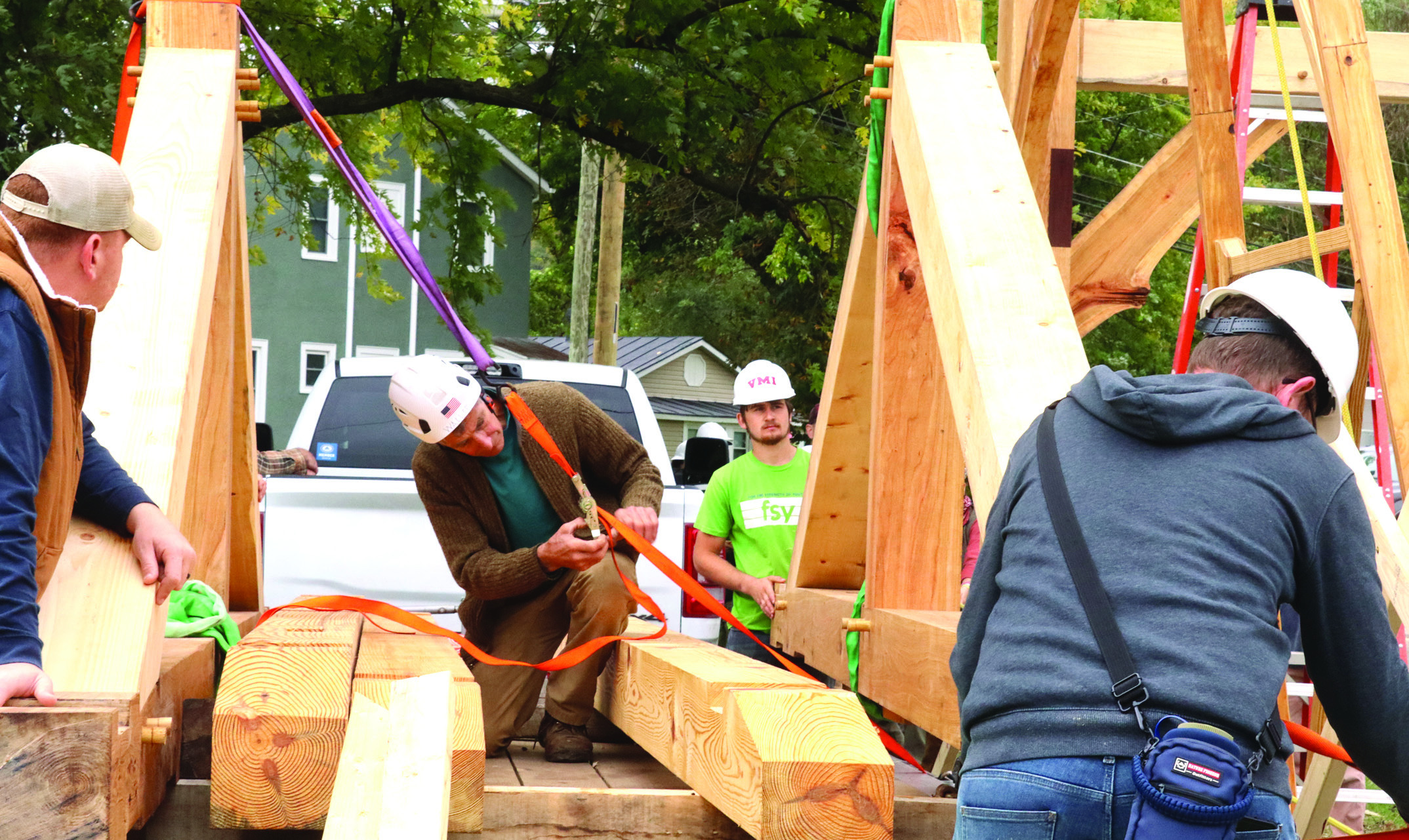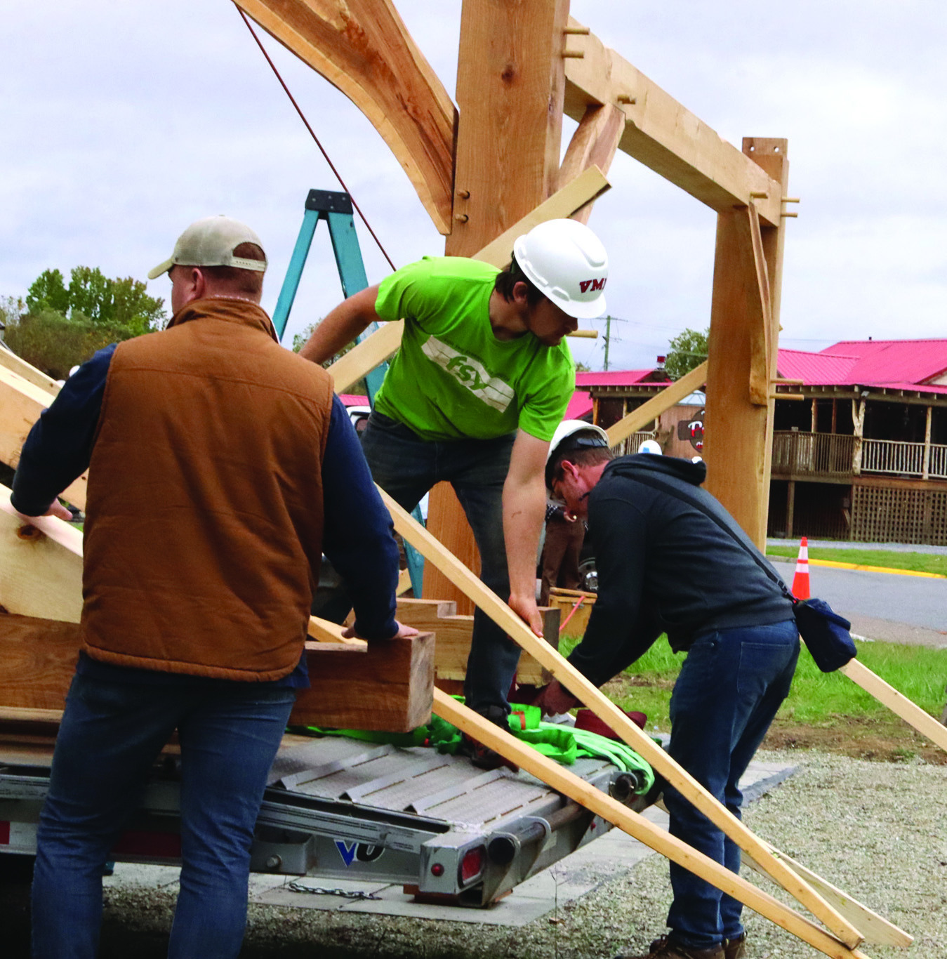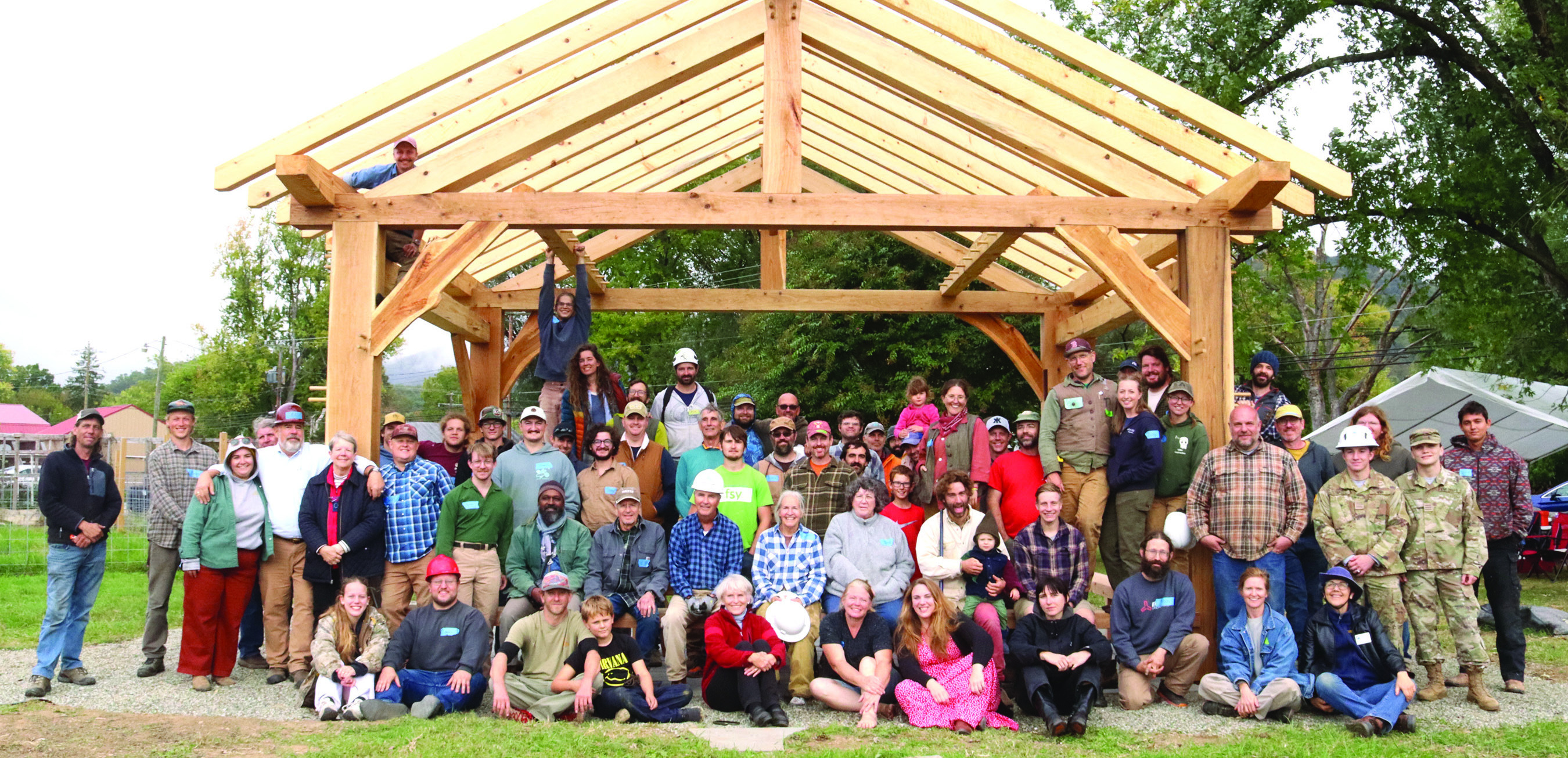 The pavilion construction at the Buena Vista Community Garden involved many volunteers from far and near. Among the local timber framers were (top left photo, at left) Grigg Mullen III, (top right photo) Grigg Mullen Jr., (photo just below that one, in green shirt) Dave Holmes, (above photo) John Waller, (photo at right, second from bottom) Xavier Kohl, and (at immediate right) Grigg Mullen Jr. All of the volunteers gathered for a group photo at the project’s end. (Stephanie Mikels photos)