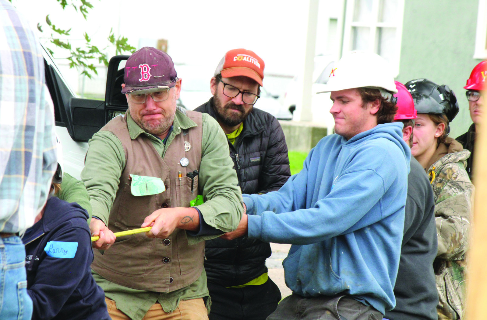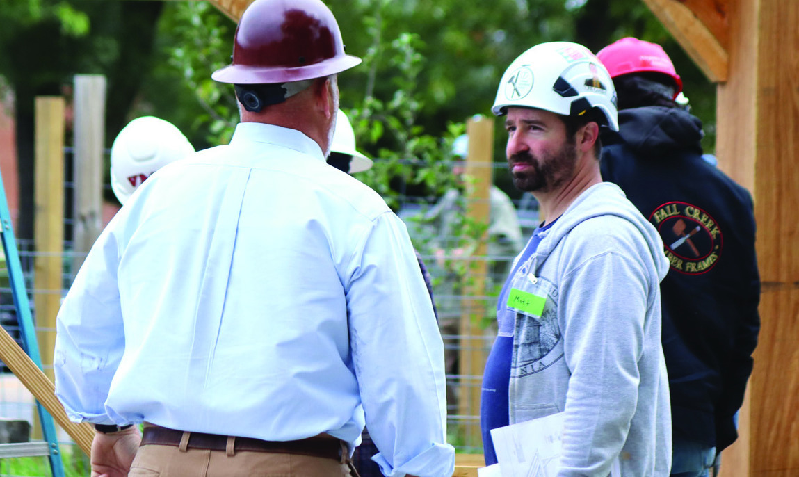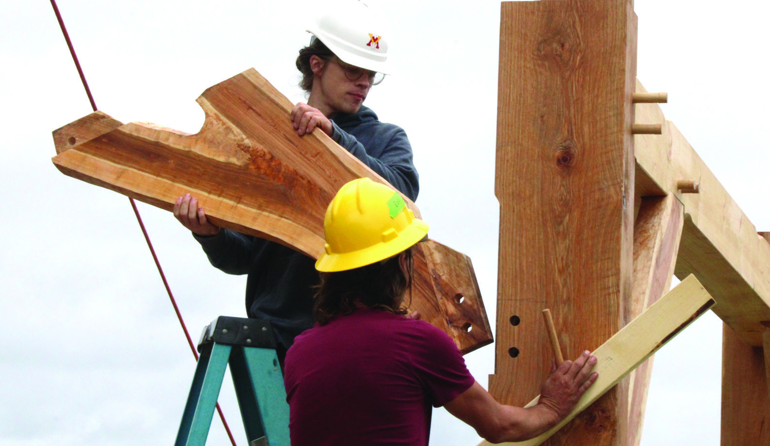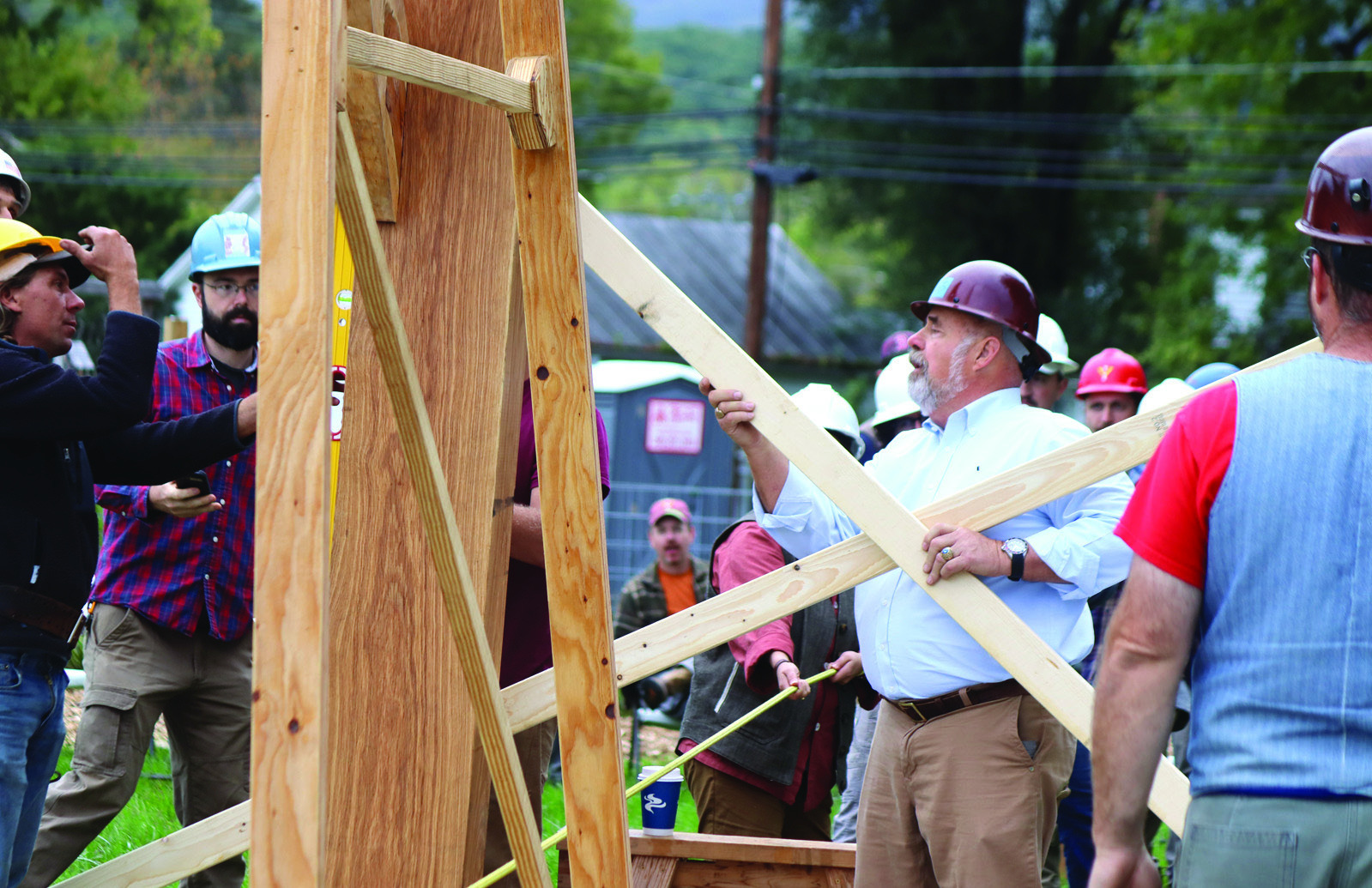 The pavilion construction at the Buena Vista Community Garden involved many volunteers from far and near. Among the local timber framers were (top left photo, at left) Grigg Mullen III, (top right photo) Grigg Mullen Jr., (photo just below that one, in green shirt) Dave Holmes, (above photo) John Waller, (photo at right, second from bottom) Xavier Kohl, and (at immediate right) Grigg Mullen Jr. All of the volunteers gathered for a group photo at the project’s end. (Stephanie Mikels photos)