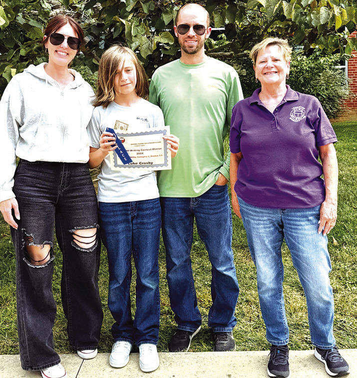 Two local students who participated in the Lexington Woman’s Club writing contest were notified that their submissions won national awards. The General Federation of Women’s Clubs awarded first place to Adeline Barker in the grades kindergarten through second category, and to Luke Crosby, in the third through fifth grades category. Both entered poetry pieces. Adeline attends Rockbridge Christian Academy and Luke is a student at Maury River Middle School. Adeline (in photo at left) is pictured with mom Lindsay and Woman’s Club member Lydia Shiver, who presented the award. Luke (at right) is pictured with his parents Amy and Jared, along with Shiver.