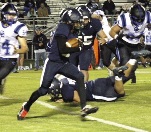 PM’S ZAVION Dunn blocks for quarterback Nathan Glass, who led the Blues with 68 yards on 13 carries and passed for 104 yards. (Ronnie Coffey photo)
