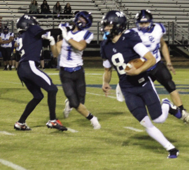 ABOVE, PM senior quarterback Nathan Glass runs with the ball. AT LEFT, Fighting Blue senior running back Zavion Dunn takes the ball down the field. (Ronnie Coffey photos)