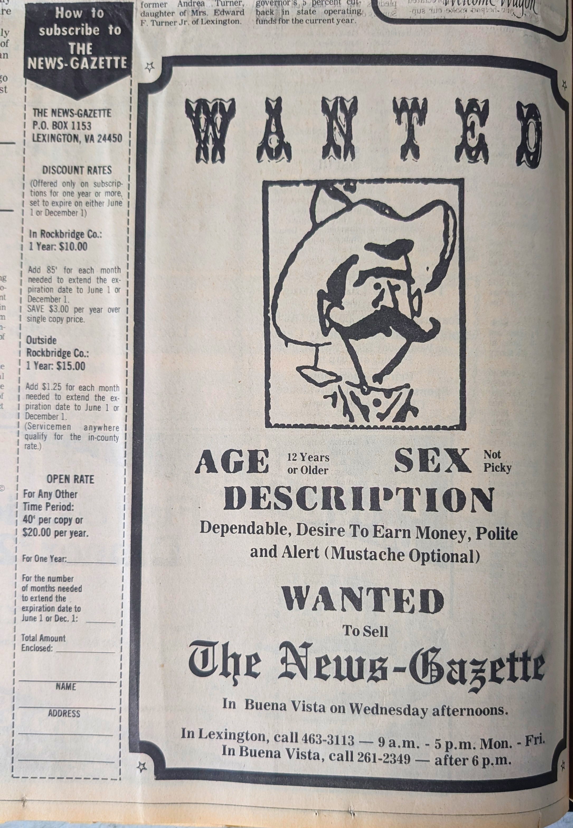Photo of AD: A help wanted ad published by The News-Gazette, looking for someone at least 12 years old to sell newspapers on Wednesdays in Buena Vista.