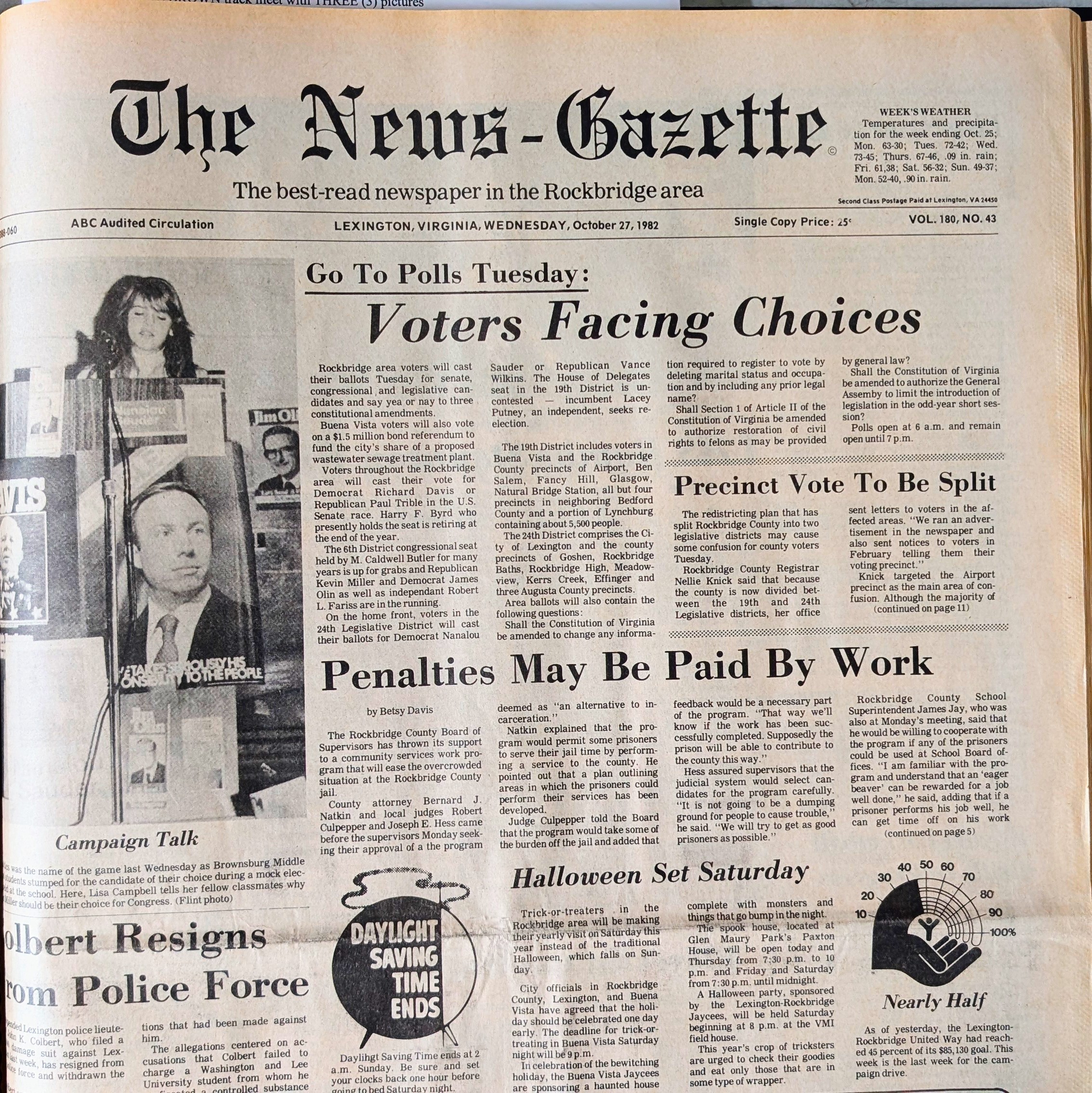 Penalties May Be Paid By Work - A story by Betsy Davis about a proposal for Rockbridge County prisoners to do community service instead of serving time in prison. The proposal is meant to be a solution to the crowding of the county jail.