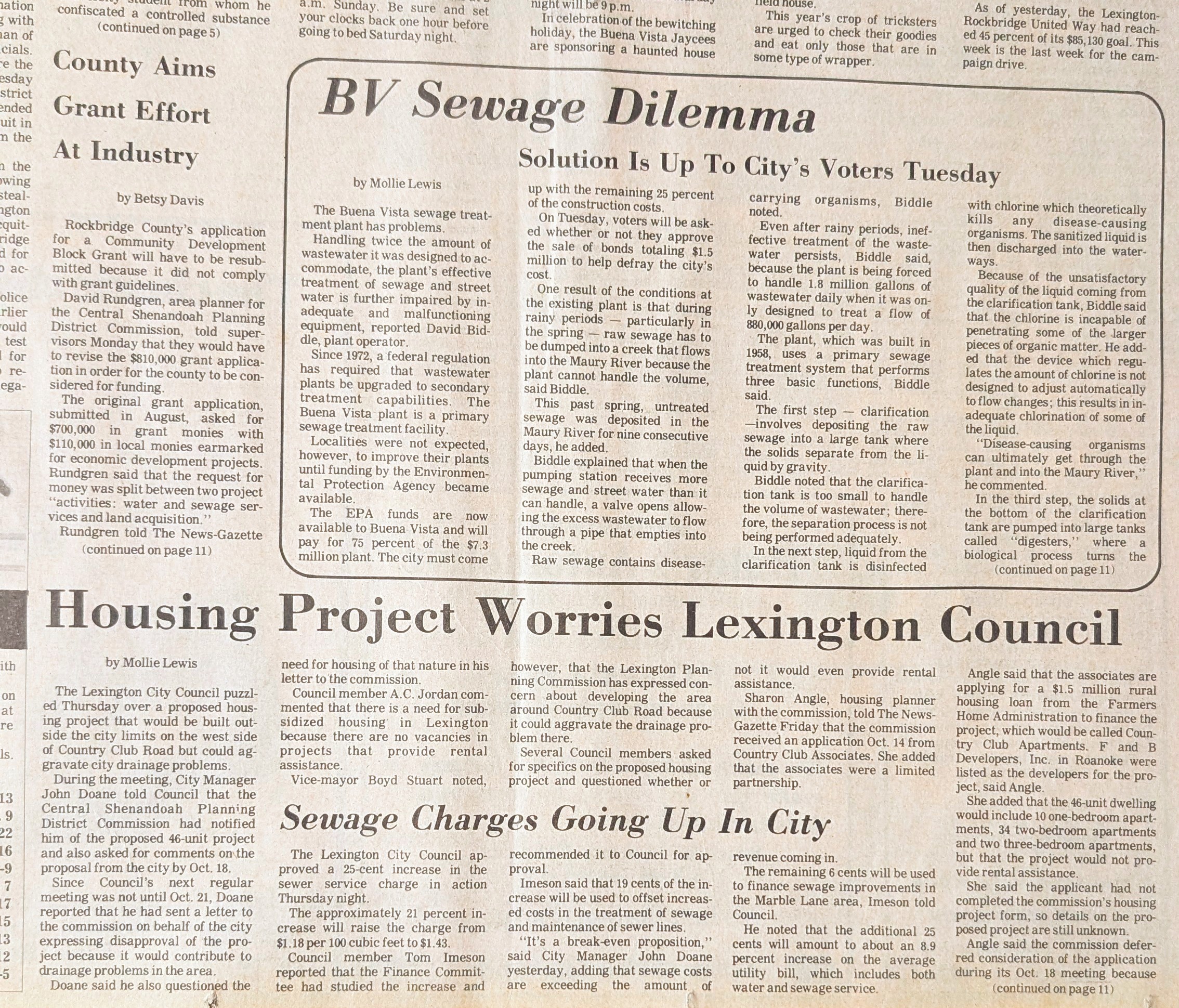 BV Sewage Dilemma - Solution Is Up To City's Voters Tuesday: An article by Mollie Lewis detailing the state of the water treatment facility in Buena Vista at that time, and therefore why it needed the funds to be upgraded.