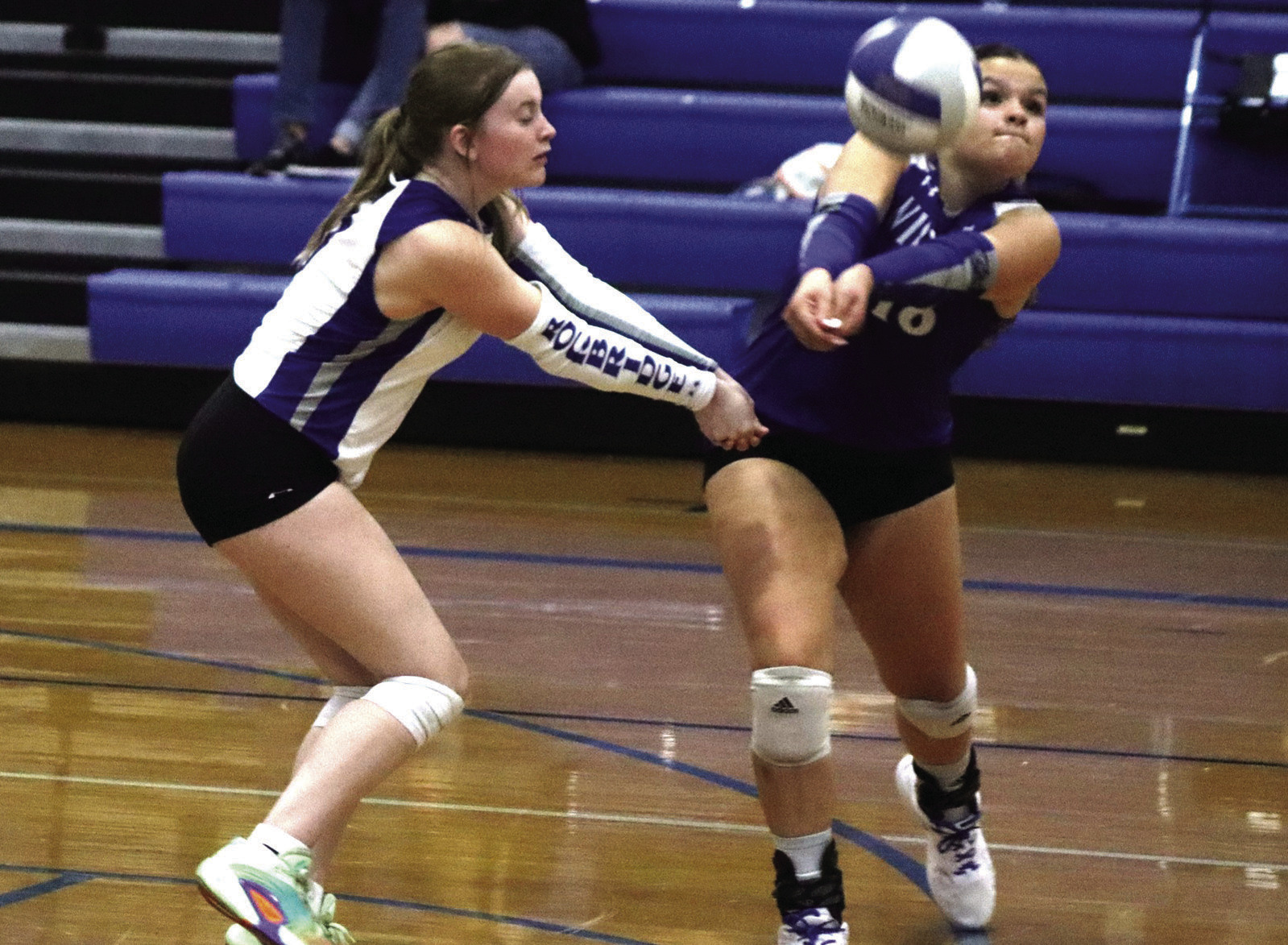 WILDCAT SENIOR libero Ava Crocker (left) and sophomore outside hitter Cesi Beidle get in position for a dig. Crocker led the RC with 27 digs, while Beidle had 10 kills and a team-high six aces before suffering an injury that kept her out of the fifth and final set. (Stephanie Mikels Blevins photo)