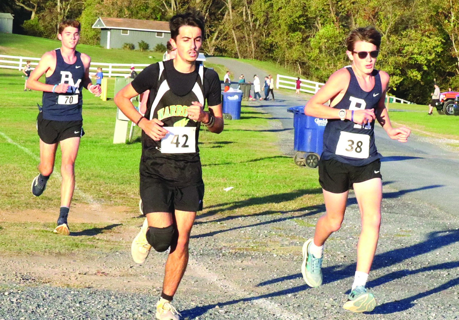 PM FRESHMAN Matthew Cooper (38) runs next to a Narrows runner while PM sophomore Sebastian George (70) follows them. Cooper led the Blues, placing sixth of 18 harriers, completing the 3-mile course in 20:17, and George finished ninth in 20:33. (Stephanie Mikels Blevins photo)