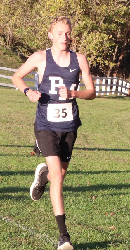 FIGHTING BLUE junior Sam Carpenter paces himself. Carpenter was PM’s fifth runner, placing 14th in 22:39. (Stephanie Mikels Blevins photo)