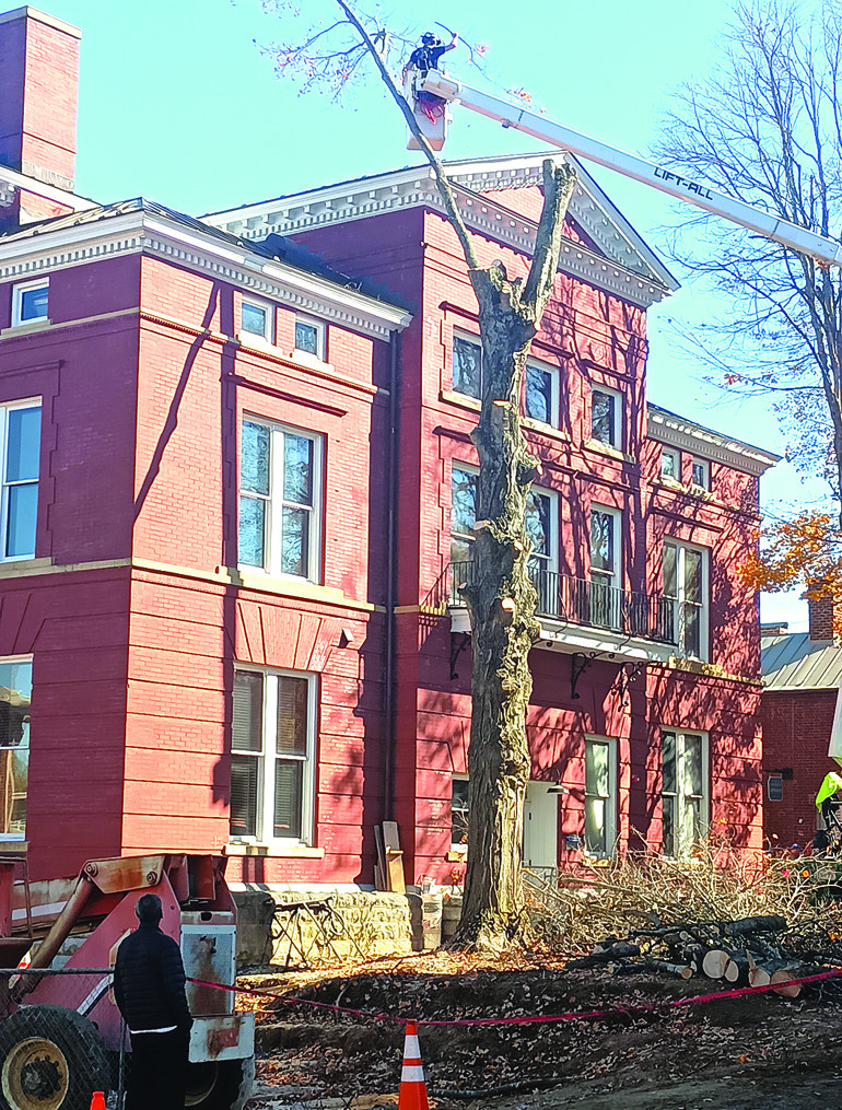 THE COURTHOUSE SQUARE renovation project is in full swing as Veterans Day approaches. The memorial was moved to its new location earlier this fall, the cannon was moved last week, and the large maple trees are being removed this week by Orrison Tree Service. Painting the cannon before it was moved were (at far left) Brandon Painter and Cameron Painter with Atlantic Finishes. (Darryl Woodson and Matt Paxton photos)