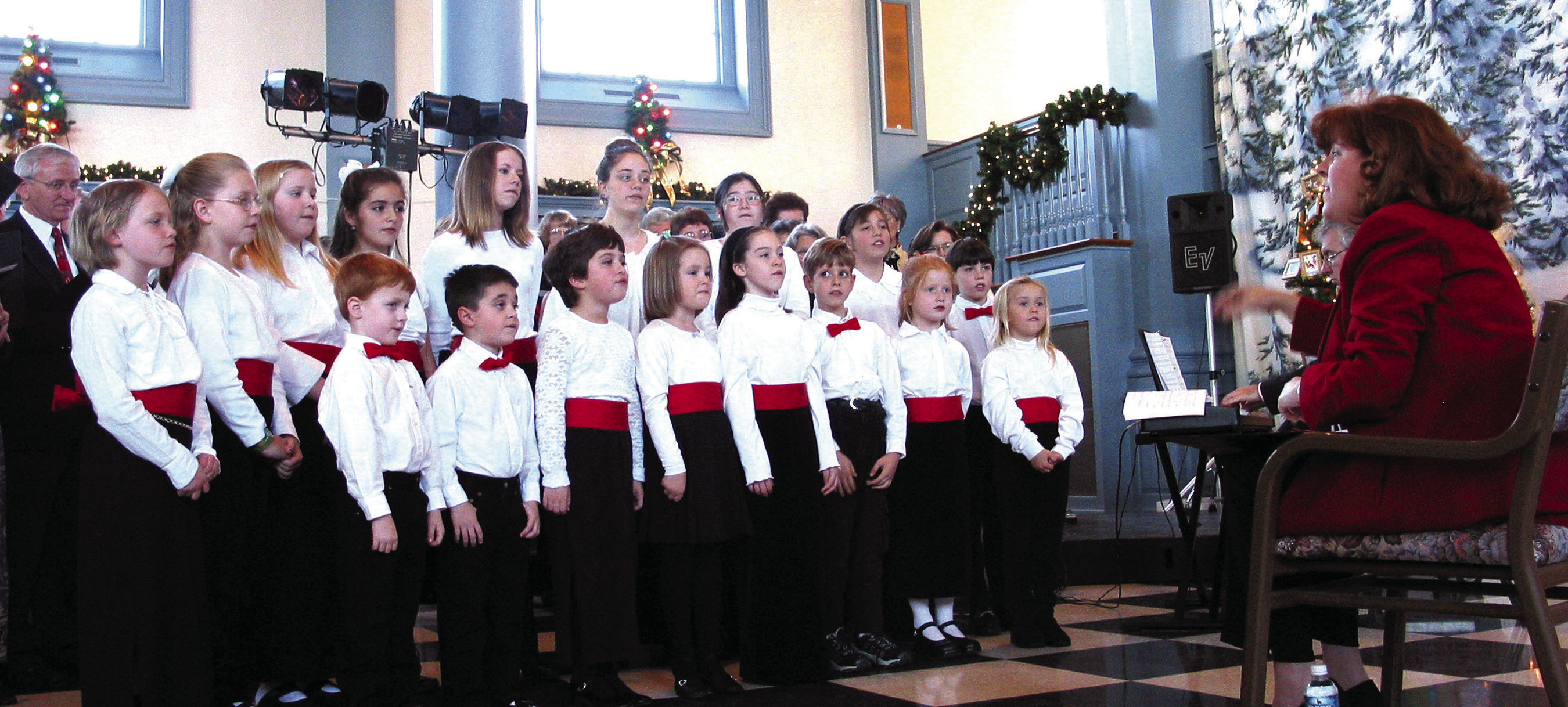 MELANIE GRIFFIS directs the Rockbridge Youth Chorale and Rockbridge Chorus singers in a 2003 Christmasbenefit concert for Project Horizon.