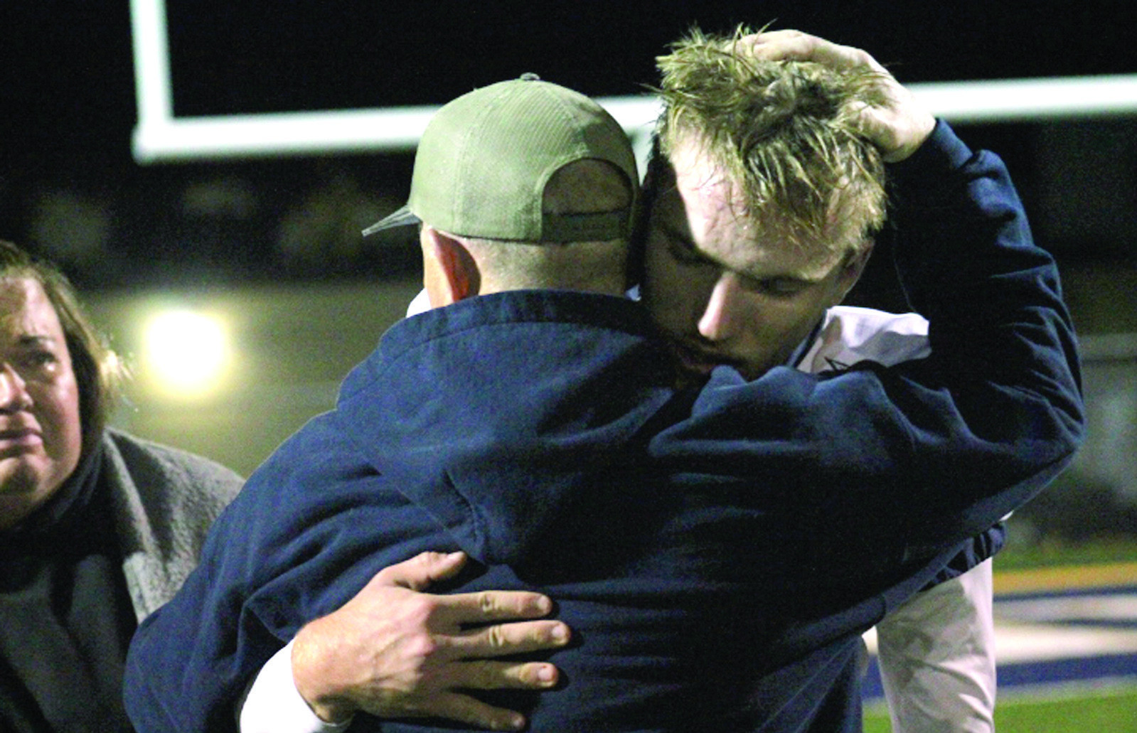 AT TOP, PM head coach Jeremiah Brockenbrough and senior quarterback Nathan Glass watch the action on the field.ABOVE,After his final high school football game, Glass hugs Brockenbrough. Glass completed 3-of-9 passes for 48 yards and the Blues’ only touchdown and rushed for 49 yards on six carries. (Ronnie Coffey photos)