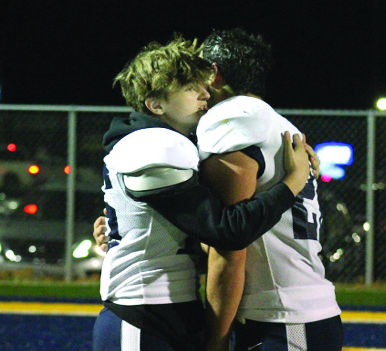 FIGHTING BLUE Tyler Shafer (left) embraces teammate Thomas Conner after the game. (Ronnie Coffey photo)