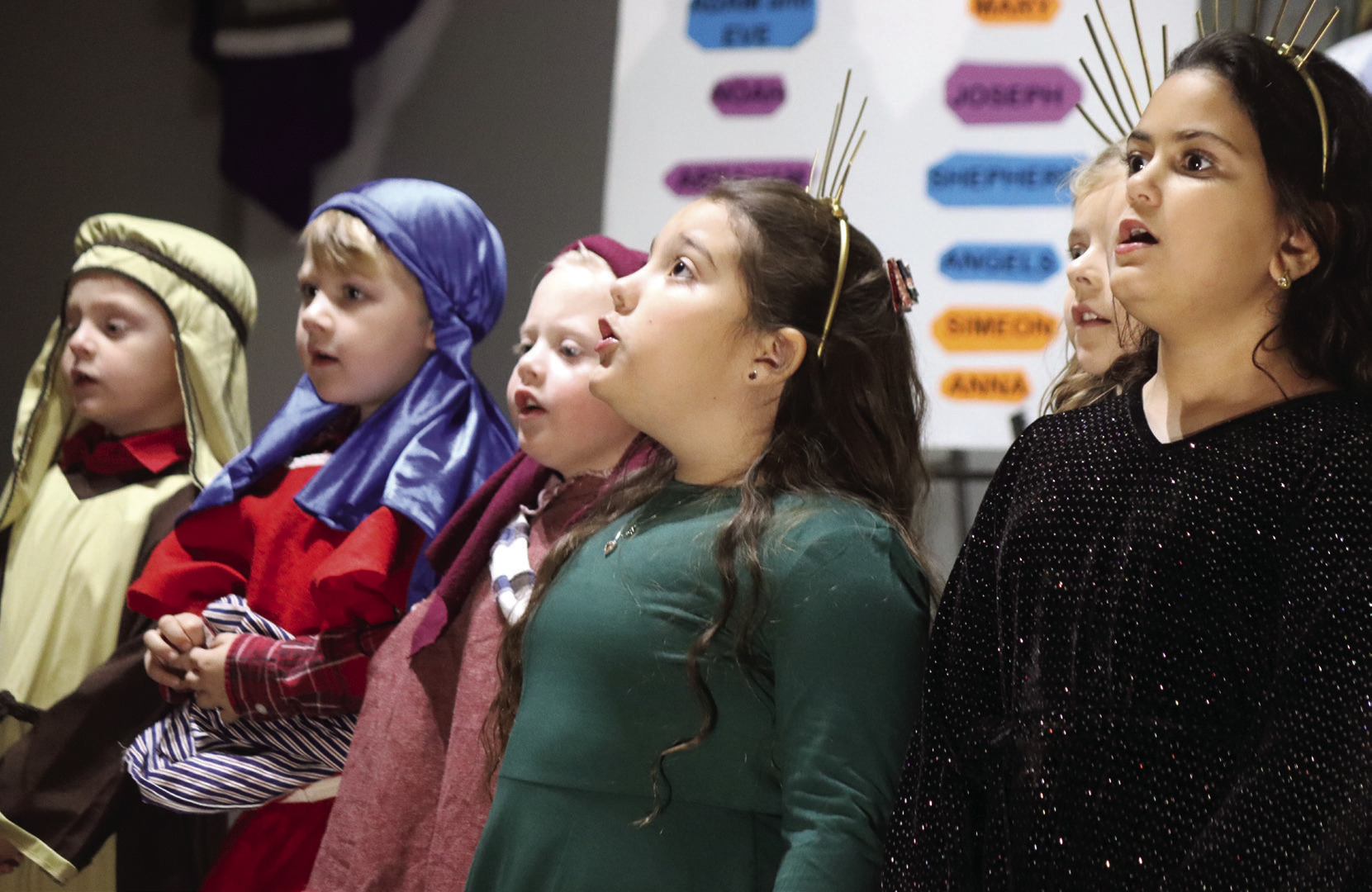 Students portraying shepherds and angels sing “Hark the Herald Angels Sing.”