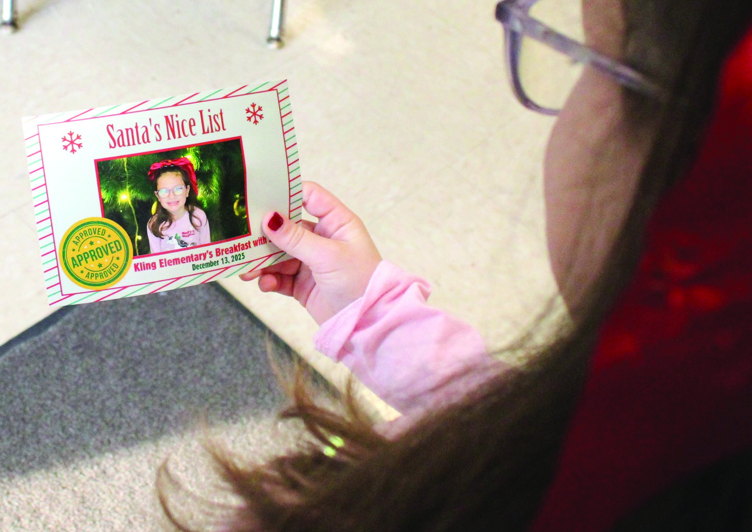 Breakfast with Santa at Kling Elementary School Saturday drew a huge turnout, with over 180 people registering. While pancakes, talks with Santa and writing and mailing letters to Santa were a big part of the morning’s activities, children also got to find out if they were on the naughty or nice list thanks to a naughty or nice meter (below). Then they received a card with Santa’s seal of approval (below right). (Stephanie Mikels Blevins photos)