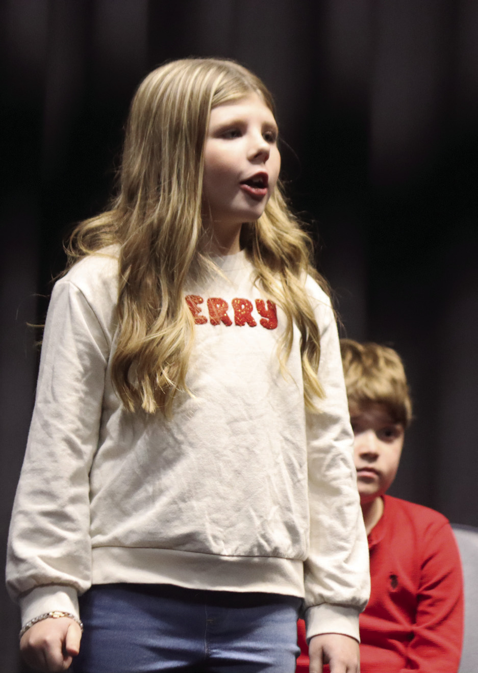 Amid all of last week’s snow events, Mountain View Elementary School students were able to perform their winter performance, “Snow Way Out,” on schedule Thursday. Among the scenes were (counter-clockwise from above) the choir performing; students acting in the hotel scene; soloist Channy Tomlin singing “Angels in the Snow”; and Chasyn Miller portraying Old Man Winter. (Stephanie Mikels Blevins photos)