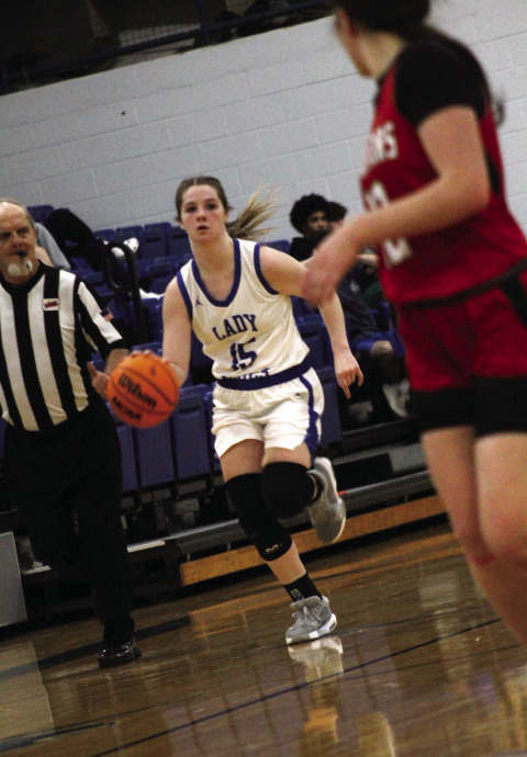 PM’S KAYLEIGH Ramsey dribbles down the court while a defender awaits her. (Ronnie Coffey photo)