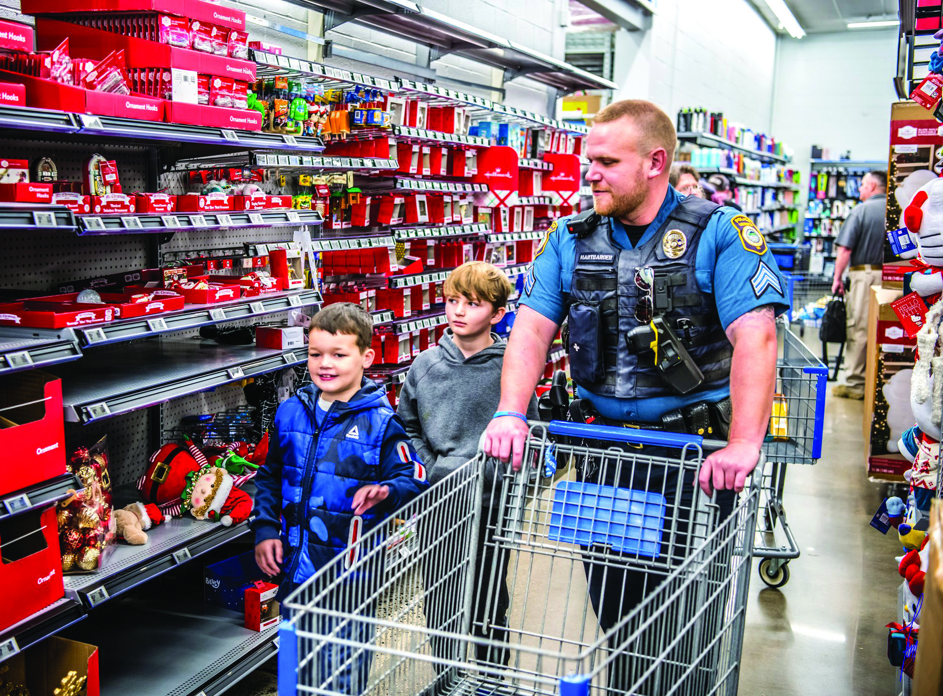 Officers from several state and local law enforcement agencies gathered at Walmart in Lexington on Saturday for the annual Shop with a Cop event. Officers and deputies from the Buena Vista Police Department, Buena Vista Sheriff’s Office, Lexington Police Department, Rockbridge County Sheriff’s Office, Rockbridge Regional Jail and Virginia Park Police took local children through the store to shop for Christmas gifts (above and below). Attendees also got to visit with Santa Claus and the Grinch (left). (photos courtesy of the Rockbridge County Sheriff’s Office)