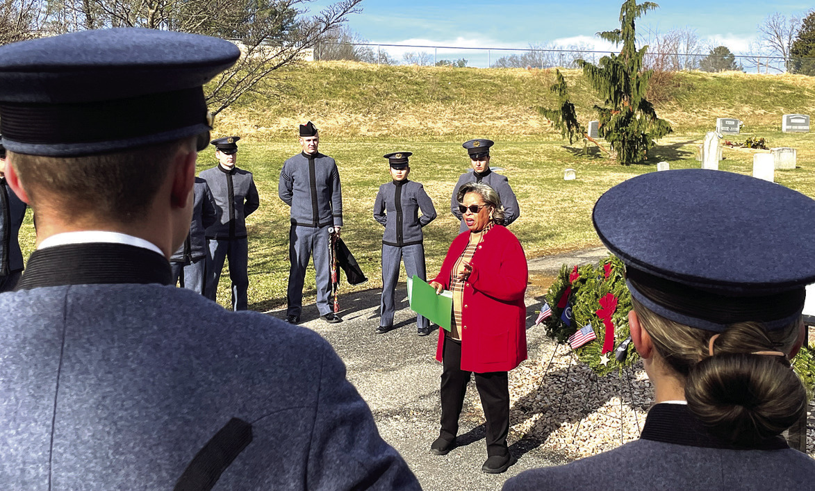 Fourteen VMI cadets, members of the Building BRIDGES Club, participated in the wreath laying alongside community members, volunteering during their final weekend before winter furlough. The cadets supported the local nonprofit Remembering Rockbridge Veterans as part of the national Wreaths Across America observance.