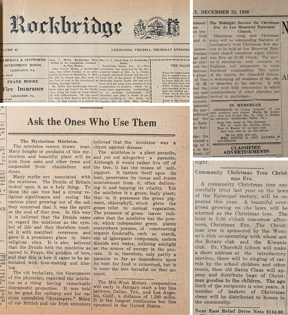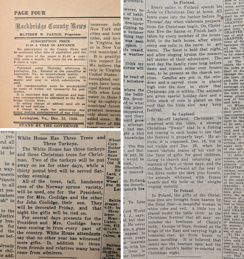 Whether you or your family celebrate Christmas or not, this global holiday is celebrated in a myriad of ways around the world. 100 years ago, The Rockbridge County News reported not only how this area celebrated, but other countries as well.