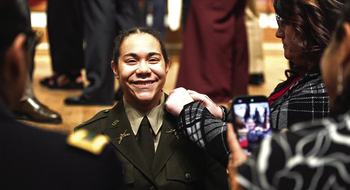 ABOVE, Virginia Military Institute graduates sing “The Spirit” at the conclusion of the commencement ceremony in Memorial Hall last Thursday. AT LEFT, Audrianna Kelly, a new second lieutenant, beams as she receives her pins during the commissioning ceremony the evening before. (VMI photos by H. Lockwood McLaughlin)