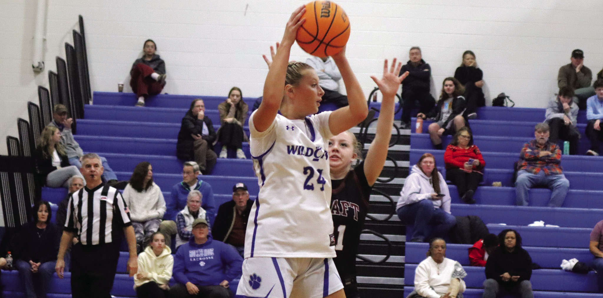 WILDCAT SOPHOMORE forward Madison Mangione looks for an open teammate while closely guarded. Mangione pulled down five rebounds and grabbed one steal. (Stephanie Mikels Blevins photo)