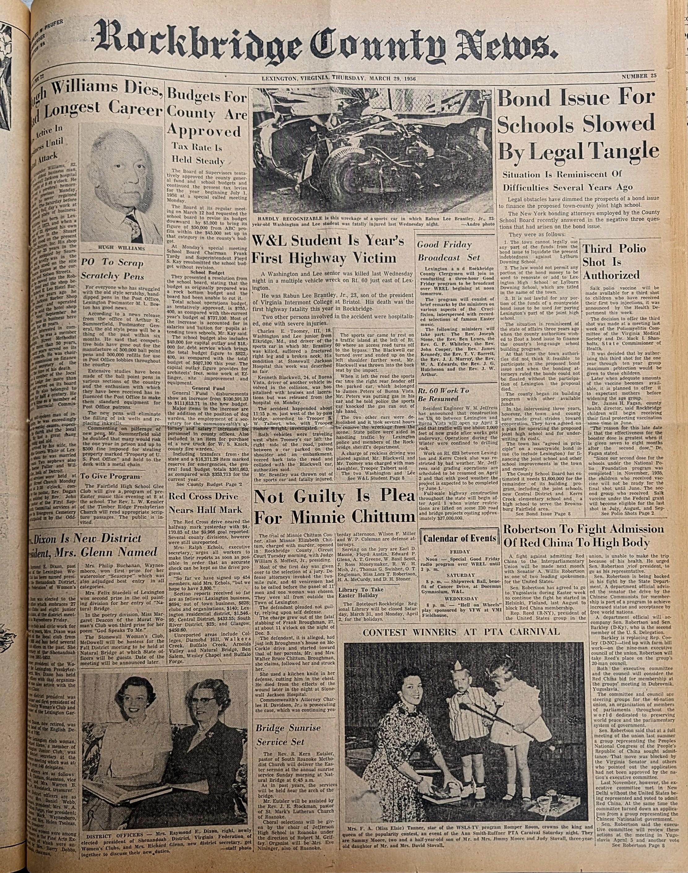 "W&L Student is Year's First Highway Death" and reports that 1956 had no deaths on Rt 60 until Rabun Lee Brantley Jr. died in an accident there.
