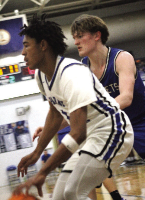 PM JUNIOR guard Langston Cook dribbles the ball while guarded by a Craig County player. Cook led the Blues with 24 points in the 71-22 win. (Ronnie Coffey photo)