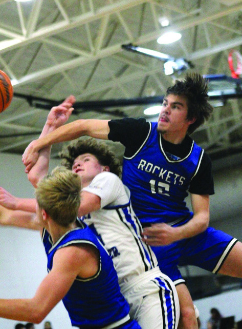 ABOVE, Fighting Blue sophomore guard Brody Coleman battles two Craig County players for the ball. AT LEFT, PM senior forward Sam Griffin goes up for a shot. (Ronnie Coffey photos)