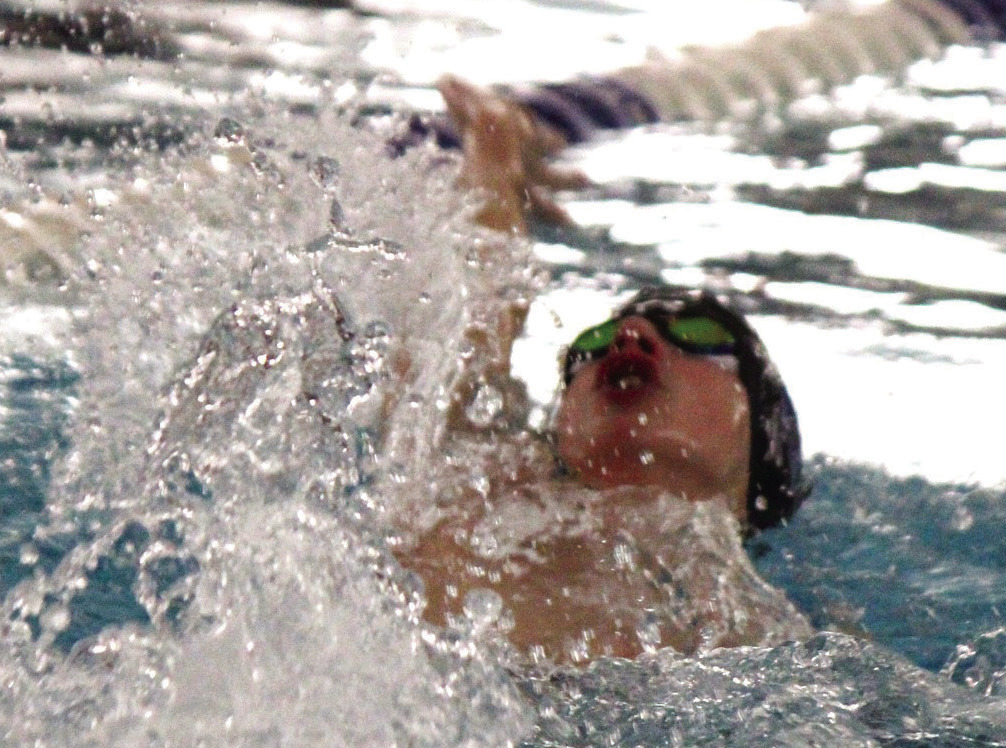WILDCAT FRESHMAN Elliot Steele races in the backstroke section of the boys’ 200-yard medley relay, which the Wildcats won in a regional-qualifying time of 1:49.41. (Stephanie Mikels Blevins photo)