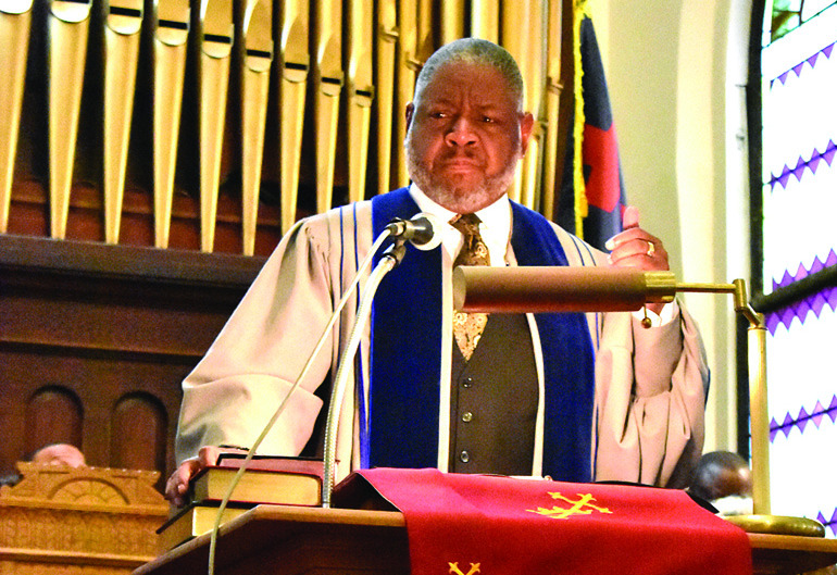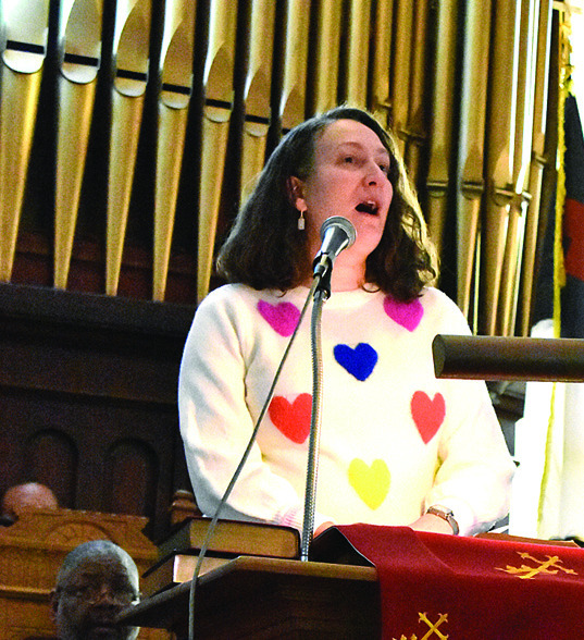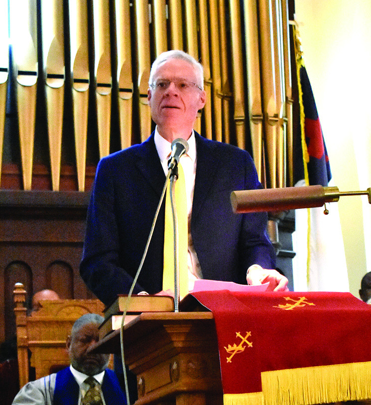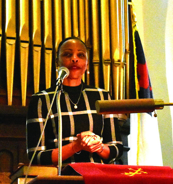 It may have been cold outside on Sunday, but it was warm inside First Baptist Church where a community worship service was held to honor the memory of Dr. Martin Luther King Jr. Community leaders, area ministers and two college presidents spoke at the service. AT TOP LEFT, Lt. Gen. David J. Furness, superintendent of VMI, shared that the vision of VMI is to produce people of character. MIDDLE LEFT, Dr. Lena Hill, W&L provost, talked about her father who marched with Dr. King. BELOW LEFT, PastorAnita Mays Lucord of Trinity United Methodist Church gave the Old Testament reading from Amos. MIDDLE BELOW, Dr. William C. Dudley, W&L president, said that education is essential in achieving King’s goals. BELOW RIGHT, keynote speaker Dr. Jerome J. Washington called King a prophet and a martyr and the day that commemorates his birth “a day of conscience.” ABOVE, The Resurrecting Praise Community Choir ofAlleghany County performed several songs during the service, concluding with a rousing rendition of “We Shall Overcome.” William McCorckle (at top left) sat in with the choir and played the church’s pipe organ.(Joann Ware photos)