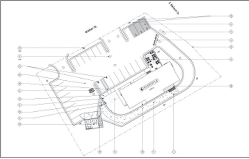 WHEN CONSIDERING the application for exterior renovations to the former KFC building to turn it into a Chipotle, the Lexington Planning Commission was presented with design drawings. The drawing above shows the proposed changes to the Walker Street side of the building, which include moving the main entrance of the restaurant closer to Nelson Street and removing two parking spaces on that end of the building for an outdoor dining patio. The Planning Commission also saw the site plan (below), which shows the proposed dining patio and the location of an 81-square-foot abutment on the rear side of the building for a new drive-thru window.