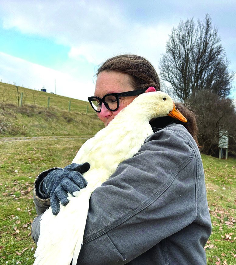 JEANINE WITTLINGER hugs Flower, who she has cared for since it was a duckling. Flower used to have difficulty walking but overcame their disability due to Wittlinger’s rehabilitation efforts. (Ava Tallat-Kelpsa photo)